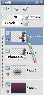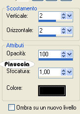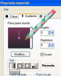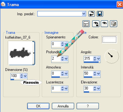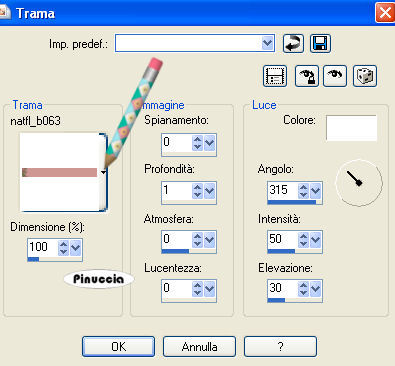 qui puoi trovare qualche risposta ai tuoi dubbi. Se l'argomento che ti interessa non è presente, ti prego di segnalarmelo. Occorrente: Materiale qui Il tube è di Yoka Apri i tubes in PSP e metti le trame nella cartella Trame. Scegli due colori dal tube. Io ho scelto #793956 e #272631. Passa il colore di primo piano a Gradiente lineare, con i seguenti settaggi: il colore scuro deve trovarsi sotto: ![]() Apri una nuova immagine trasparente 700 x 500 pixels, e riempila con il gradiente.Effetti>Effetti di trama>Trama: apri il menu delle trame cliccando sulla freccia a fianco del box, cerca e seleziona la trama natfl_b063: ![]() Immagine>Rifletti. Effetti>Effetti di trama>Trama: cerca e seleziona la trama koffiekitten_07_6; attenzione!: devi cambiare soltanto il settaggio della profondità a 2. ![]() Attiva l'immagine di sfondo e vai a Modifica>Copia. Torna al tuo lavoro e vai a Modifica>Incolla>Incolla come nuovo livello. Spostala a sinistra.![]() Attiva il tuo tube e vai a Modifica>Copia. Torna al tuo lavoro e vai a Modifica>Incolla>Incolla come nuovo livello. Sposta il tube a destra.![]() Livelli>Duplica. Attiva il livello inferiore (il livello del tube originale). ![]() Effetti>Effetti di distorsione>Vento, intensità 100 da sinistra. ![]() Abbassa l'opacità del livello al 75%. Attiva nuovamente il livello superiore del tube. ![]() Effetti>Effetti 3D>Sfalsa ombra, con i seguenti settaggi, colore nero: ![]() Livelli>Nuovo livello raster. Attiva lo strumento Testo , font 911Porscha, dimensione 48, mobile.dovrai regolare la dimensione a seconda della lunghezza del testo e della versione di PSP che stai usando. I pixels di PSP 9 non corrispondono a quelli di PSP X: su queste differenze vedi qui Scrivi il tuo testo e mantieni selezionato. Effetti>Effetti 3D>Sfalsa ombra, con i seguenti settaggi, colore nero: ![]() Effetti>Effetti di trama>Rilievo. Selezione>Nessuna selezione. Cambia la modalità di miscelatura di questo livello in Luce diffusa. Se il risultato non ti piace, puoi tornare indietro con Modifica>Annulla azione proprietà livello; Annulla azione deseleziona; annulla azione rilievo. e ripeti soltanto Selezione>Nessuna selezione. Questo è quello che ho fatto io con l'esempio sotto il titolo. Nell'esempio in fondo al tutorial, invece, il risultato con l'effetto Rilievo. Aggiungi, se vuoi. il tuo watermark. Livelli>Unisci>Unisci tutto e salva in formato jpg. ![]() ![]() Se hai problemi o dubbi, o trovi un link non funzionante, o anche soltanto per un saluto, scrivimi 22 Settembre 2007 |
