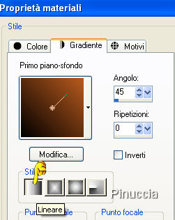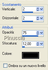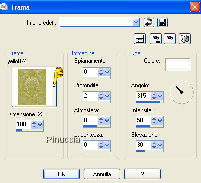 qui puoi trovare qualche risposta ai tuoi dubbi. Se l'argomento che ti interessa non è presente, ti prego di segnalarmelo. Occorrente: Materiale qui I tubes delle donne sono di Jet Metti la trama nella cartella Trame e apri i tubes in PSP. Apri una nuova immagine trasparente 700 x 500 pixels. Imposta il colore di primo piano con il nero (#000000), e il colore di sfondo con un colore preso dal tube. Io ho usato #b85a1e. Passa il colore di primo piano a Gradiente di primo piano/sfondo, stile lineare, angolo 45, ripetizioni 0. ![]() Riempi l'immagine trasparente con il gradiente.Effetti>Effetti di trama>Trama: apri il menu a fianco del box, cerca e seleziona la trama yello074, con i seguenti settaggi. ![]() Attiva lo strumento Forme predefinite , rettangolo,visualizza il righello (Visualizza>Righelli oppure premi sulla tastiera la combinazione di tasti CTRL+ALT+R). Traccia un rettangolo partendo a 70 pixels da sinistra e dall'alto, fino a destra a 630 pixels e in basso a 430 pixels. ![]() Livelli>Converti in livello raster. Effetti>Effetti 3D>Sfalsa ombra, con i seguenti settaggi, colore nero. ![]() Livelli>Duplica. Immagine>Ruota>Ruota per gradi, 5 gradi a destra. ![]() Livelli>Duplica. Immagine>Ruota>Ruota per gradi, 10 gradi a sinistra. ![]() ![]() Attiva l'immagine di sfondo Saphiere dreams e vai a Modifica>Copia. Torna al tuo lavoro e vai a Modifica>Incolla>Incolla come nuovo livello. La modalità di miscelatura di questo livello è già correttamente impostata su Luminanza (esistente). Attiva Rustic(8) e vai a Modifica>Copia. Torna al tuo lavoro e vai a Modifica>Incolla>Incolla come nuovo livello. Spostalo a sinistra.Attiva Rustic(10) e vai a Modifica>Copia. Torna al tuo lavoro e vai a Modifica>Incolla>Incolla come nuovo livello. Spostalo a sinistra, facendolo coincidere con i fori.![]() Attiva il tube della donna e vai a Modifica>Copia. Torna al tuo lavoro e vai a Modifica>Incolla>Incolla come nuovo livello. Sposta questo tube a destra.Effetti>Effetti 3D>Sfalsa ombra, con i settaggi precedenti. Nella paletta dei livelli attiva il livello inferiore Attiva Rustic(1) e vai a Modifica>Copia. Torna al tuo lavoro e vai a Modifica>Incolla>Incolla come nuovo livello. Spostalo un po' a sinistra.Vedi il mio esempio. Livelli>Duplica, e spostalo un po' a destra.Immagine>Capovolgi. Livelli>Disponi>Sposta giù. Livelli>Unisci>Unisci tutto. Aggiungi il tuo nome e/o il tuo watermark. Per il mio testo ho usato il font Cocktail Script, dimensione 36. ![]() ![]() Se hai problemi o dubbi, o trovi un link non funzionante, o anche soltanto per un saluto, scrivimi. 8 Dicembre 2007 |