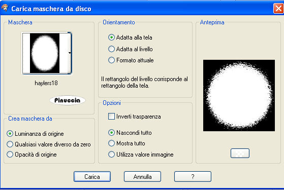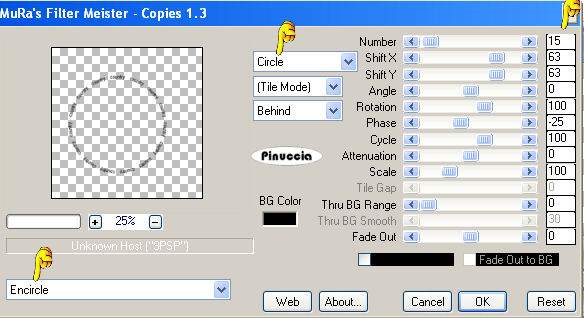 qui puoi trovare qualche risposta ai tuoi dubbi. Se l'argomento che ti interessa non è presente, ti prego di segnalarmelo. Occorrente: Materiale qui Filtro: Mura's Meister qui Non conosco l'autore del tube. Se lo conosci, per favore, mandami una mail per dargli il giusto credito. Metti la maschera nella cartella Maschere e apri i tubes in PSP. Apri una nuova immagine BIANCA 600 x 600 pixels. Livelli>Nuovo livello raster. Selezione>Seleziona tutto. Apri gerberasImage e vai a Modifica>Copia. Torna al tuo lavoro e vai a Modifica>Incolla nella selezione. Livelli>Carica/Salva maschera>Carica maschera da disco. Cerca e carica la maschera haylers 18, inverti trasparenza non selezionato. ![]() Effetti>Effetti di bordo>Aumenta. Livelli>Unisci>Unisci gruppo. Chiudi il colore di primo piano e imposta il colore di sfondo con il nero (#000000). Attiva lo strumento Testo ,font Arial, dimensione 18, e scrivi "Country", (o un altro testo o il tuo nome). ![]() Effetti>Plugins>Mura's Meister - Copies: ![]() Se usi un altro testo, dovrai giocare con le prime tre voci per ottenere un cerchio adeguato alla tag. Sposta il testo al centro della maschera.Apri frameCarefull e vai a Modifica>Copia. Torna al tuo lavoro e vai a Modifica>Incolla come nuovo livello. Apri CountryGurl, e vai a Modifica>Copia. Torna al tuo lavoro e vai a Modifica>Incolla come nuovo livello. Sposta il tube un po' più in basso.Effetti>Effetti 3D>Sfalsa ombra, con i seguenti settaggi, colore nero. ![]() Apri sunflower fence, e vai a Modifica>Copia. Torna al tuo lavoro e vai a Modifica>Incolla come nuovo livello. Spostalo in basso.Effetit>Effetti 3D>Sfalsa ombra, con i settaggi precedenti. Livelli>Unisci>Unisci tutto. Aggiungi il tuo watermark e salva in formato jpg. ![]() Se hai problemi o dubbi, o trovi un link non funzionante, o anche soltanto per un saluto, scrivimi. 13 Maggio 2008 |