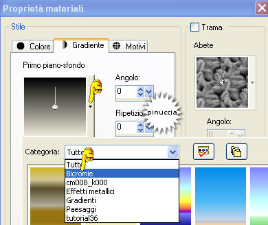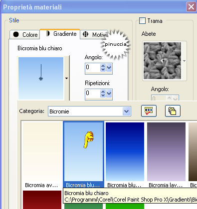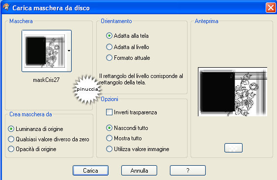 qui puoi trovare qualche risposta ai tuoi dubbi. Se l'argomento che ti interessa non è presente, ti prego di segnalarmelo. Occorrente: Materiale qui Metti la maschera nella cartella Maschere e apri i tubes in PSP. Apri una nuova immagine trasparente 700 x 500 pixels. Imposta il colore di primo su Gradiente, apri il menu cliccando sulla freccia a fianco del box, e apri il sottomenu dei gradienti bicolori. ![]() Seleziona il gradiente bluchiaro. ![]() Riempi l'immagine trasparente con il gradiente.Livelli>Nuovo livello raster. Riempi anche questo livello con il gradiente.Livelli>Carica/Salva maschera>Carica maschera da disco. Cerca e carica la maschera maskCris27: ![]() Livelli>Unisci>Unisci gruppo. non vedrai niente perchè hai riempito il livello con lo stesso colore, ma non preoccuparti e continua. Effetti>Effetti 3D>Sfalsa ombra, con i seguenti settaggi, colore nero: ![]() Effetti>Effetti di bordo>Aumenta. Apri il tube "by stirner lady", e vai a Modifica>Copia. Torna al tuo lavoro e vai a Modifica>Incolla>Incolla come nuovo livello. Spostalo a sinistra.Livelli>Disponi>Sposta giù. Attiva nuovamente il livello superiore. Apri l'angolo (a-doodad lizztish) e vai a Modifica>Copia. Torna al tuo lavoro e vai a Modifica>Incolla>Incolla come nuovo livello. Spostalo nell'angolo in basso a sinistra.Apri il tube "stitch1" e vai a Modifica>Copia. Torna al tuo lavoro e vai a Modifica>Incolla>Incolla come nuovo livello. Posiziona la cucitura a destra, come nel mio esempio.![]() Apri Sharon Accents 011908-2, seleziona uno dei ciondoli e vai a Modifica>Copia. per identificare velocemente il livello corrispondente al ciondolo che hai scelto, attiva lo strumento Spostamento , e clicca sul cuore. Nella paletta dei livelli vedrai subito diventare attivo il relativo livello.Modifica>Copia. Torna al tuo lavoro e vai a Modifica>Incolla>Incolla come nuovo livello. Regola>Saturazione e tonalità>Viraggio: ![]() Sposta il ciondolo in alto a destra.Effetti>Effetti 3D>Sfalsa ombra, con i settaggi precedenti. Livelli>Unisci>Unisci tutto. Aggiungi il tuo nome e/o il tuo watermark. Per il mio testo ho usato il font Amelie ![]() ![]() Se hai problemi o dubbi, o trovi un link non funzionante, o anche soltanto per un saluto, scrivimi. 21 Febbraio 2008 |