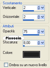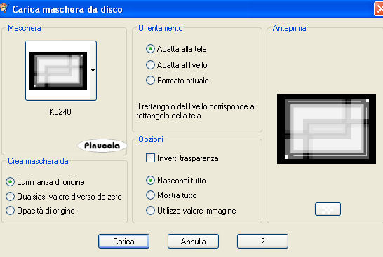 qui puoi trovare qualche risposta ai tuoi dubbi. Se l'argomento che ti interessa non è presente, ti prego di segnalarmelo. Occorrente: Materiale qui Il tube della donna è di Marif . Metti la Maschera nella cartella Maschere. Metti il pennello nella cartella dei Pennelli. fai attenzione: il pennello è composto da due files, che non devono essere separati. Trovi alcuni appunti sui pennelli qui Apri i tubes in PSP. Scegli un colore chiaro dal tube come colore di primo piano (#d7e073), e un colore scuro come colore di sfondo (#435e25). Apri una nuova immagine trasparente 700 x 500 pixels, e riempila con il colore scuro di sfondo.ricorda che, per riempire con il colore di sfondo, devi cliccare con il tasto destro del mouse. Livelli>Nuovo livello raster. Riempi il nuovo livello con il colore chiaro di primo piano.Livelli>Carica/Salva maschera>Carica maschera da disco. Cerca e carica la maschera masker KL240, inverti trasparenza non selezionato. ![]() Effetti>Effetti di bordo>Aumenta. Livelli>Unisci>Unisci gruppo. Attiva il tube Marif octobre2006, e vai a Modifica>Copia. Torna al tuo lavoro e vai a Modifica>Incolla>Incolla come nuovo livello. Questo tube ha già il suo Effetto Sfalsa ombra. Se vuoi usare una delle tue immagini, dovrebbe essere di almeno 450 x 250 pixels. E questi sono i settaggi dell'Effetto Sfalsa ombra, che dovrai usare in questo caso: ![]() Ripeti l'Effetto Sfalsa ombra, ma cambiando verticale e orizzontale a -2. Attiva SnakeRingband, e vai a Modifica>copia. Torna al tuo lavoro e vai a Modifica>Incolla>Incolla come nuovo livello. Spostalo a sinistra.Attiva il tube del nastrino "JB 1xmas-bow009" e vai a Modifica>copia. Torna al tuo lavoro e vai a Modifica>Incolla>Incolla come nuovo livello. Spostalo in alto a destra.Effetti>Effetti 3D>Sfalsa ombra, con i seguenti settaggi, colore nero. ![]() Attiva il livello di sfondo. Attiva lo strumento Pennello ![]() cerca e seleziona il pennello SG_script3, e applicalo con il colore chiaro di primo piano in alto a sinistra e in basso a destra. Livelli>Unisci>Unisci tutto. Immagine>Aggiungi bordatura, 2 pixels, simmetriche, con il colore di primo piano. Aggiungi il tuo nome e/o il tuo watermark. Io ho usato il font Marlowe, dimensione 48 pixels. Per questo tutorial puoi anche usare un'immagine o una foto natalizia. ![]() ![]() Se hai problemi o dubbi, o trovi un link non funzionante, o anche soltanto per un saluto, scrivimi. 19 Dicembre 2007 |
