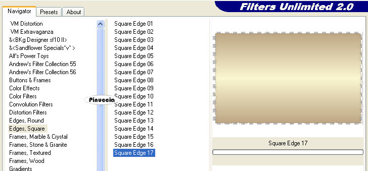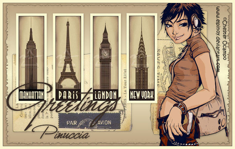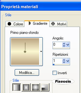 qui puoi trovare qualche risposta ai tuoi dubbi. Se l'argomento che ti interessa non è presente, ti prego di segnalarmelo. Occorrente: Materiale qui il tube è di Chester Ocampo. Filtro: Filters Unlimited 2.0 qui Apri il font e minimizzalo. Lo troverai nella lista dei font disponibili, quando ti servirà. Apri una nuova immagine trasparente 800 x 500 pixels. Scegli due colori dal tube. Io ho usato come colore di primo piano #bba381, e come colore di sfondo #fbf7d1. Passa il colore di sfondo a Gradiente di primo piano/sfondo, stile lineare, con i seguenti settaggi: ![]() ![]() Riempi l'immagine trasparente con il gradiente.ricorda che, essendo il gradiente impostato come colore di sfondo, per riempire devi cliccare con il tasto destro del mouse. Livelli>Nuovo livello raster. Riempi il nuovo livello ancora con il gradiente.Effetti>Plugins>Filters Unlimited 2.0 - Edges Squares - Square edge 17. ![]() Effetti>Effetti 3D>Sfalsa ombra, con i seguenti settaggi, colore nero. ![]() Apri a-dozi's miscCards, e vai a Modifica>Copia. Torna al tuo lavoro e vai a Modifica>Incolla come nuovo livello. Sposta il tube in alto a sinistra.Effetti>Effetti 3D>Sfalsa ombra, con i settaggi precedenti. Apri bb_letter02, e vai a Modifica>Copia. Torna al tuo lavoro e vai a Modifica>Incolla come nuovo livello. Sposta il tube a destra.Effetti>Effetti 3D>Sfalsa ombra, con i settaggi precedenti. Livelli>Disponi>Sposta giù. Abbassa l'opacità di questo livello al 65%. Apri bb_letter01, e vai a Modifica>Copia. Torna al tuo lavoro e vai a Modifica>Incolla come nuovo livello. Sposta il tube in basso a sinistra.Abbassa l'opacità di questo livello al 65%. Effetti>Effetti 3D>Sfalsa ombra, con i settaggi precedenti. Chiudi i due livelli inferiori e attiva uno degli altri livelli. ![]() Livelli>Unisci>Unisci visibile. Riapri i livelli chiusi. Attiva il livello Uniti. Immagine>Ridimensiona, al 90%, tutti i livelli non selezionato. Sposta il livello un po' più a sinistra, e in basso.![]() Apri il tube e vai a Modifica>Copia. Torna al tuo lavoro e vai a Modifica>Incolla come nuovo livello. Sposta il tube a destra.Effetti>Effetti 3D>Sfalsa ombra, con i settaggi precedenti. Livelli>Unisci>Unisci tutto. Attiva lo strumento Testo ![]() Scegli un colore marrone scuro (io ho usato #3c2f27), e impostalo sia come colore di primo piano che come colore di sfondo. Seleziona il font Monika (lo trovi nello zip), crea come vettore, dimensione 100 e scrivi il tuo testo, (Greetings, o Auguri, o quello che vuoi). Livelli>Converti in livello raster. Effetti>Effetti 3D>Sfalsa ombra, con i settaggi precedenti. Cambia la dimensione in 48 pixels, e scrivi il tuo nome. Livelli>Converti in livello raster. Effetti>Effetti 3D>Sfalsa ombra, con i settaggi precedenti. Se hai usato il tube fornito con il materiale, apri il tube e posizionati sul livello del copyright. ![]() Modifica>Copia. Torna al tuo lavoro e vai a Modifica>Incolla come nuovo livello e posiziona il copyright a sinistra. Immagine>Aggiungi bordatura, 1 pixel, simmetriche, con il colore marrone scuro (#3c2f27). Immagine>Aggiungi bordatura, 10 pixels, simmetriche, con il colore #fbf7d1. Aggiungi, se vuoi, il tuo watermark e salva in formato jpg. il tube usato per questo esempio è di @nn. ![]() ![]() ![]() Se hai problemi o dubbi, o trovi un link non funzionante, o anche soltanto per un saluto, scrivimi. 6 Marzo 2008 |
