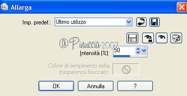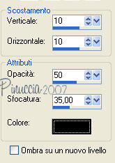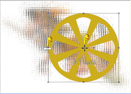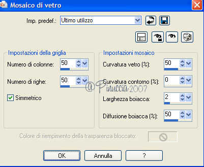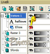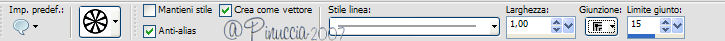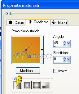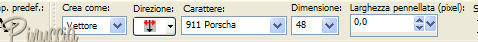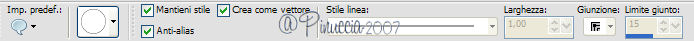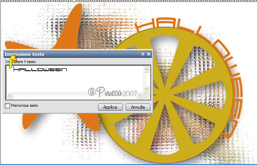 qui puoi trovare qualche risposta ai tuoi dubbi. Se l'argomento che ti interessa non è presente, ti prego di segnalarmelo. Occorrente: Materiale qui Apri i tubes in PSP e metti i pennelli nella cartella dei pennelli. Trovi alcuni appunti sui pennelli qui Apri una nuova immagine BIANCA 700 x 500 pixels. Scegli due colori dal tube. Io ho scelto come colore di primo piano l'arancio #de771c, e come colore di sfondo il gialloverde #ccae1e. Apri il tube e vai a Modifica>Copia. non chiuderlo perchè ti servirà ancora. Torna all'immagine trasparente e vai a Modifica>Incolla>Incolla come nuovo livello. Effetti>Effetti di distorsione>Allarga, intensità 50%. ![]() Effetti>Effetti di trama>Mosaico di vetro: ![]() Abbassa l'opacità di questo livello al 70%. Attiva lo strumento Forme predefinite ![]() Cerca e seleziona la forma Ruota (standard in PSP), con i seguenti settaggi: ![]() Se necessario, puoi spostare o cambiare le dimensioni della forma. Muovi il mouse sui nodi vettori. Quando, al centro, appare il segno dello spostamento , puoi spostarla.Appoggiando il mouse sui nodi centrali ai lati della forma, quando appare la doppia freccia puoi cambiare le dimensioni alla forma. ![]() Quando sei soddisfatto, vai a Livelli>Converti in livello raster. Effetti>Effetti 3D>Sfalsa ombra, con i seguenti settaggi, colore nero. ![]() Nella paletta dei colori inverti i materiali, cliccando sulla freccia al centro delle palette: ![]() Cerca e seleziona la forma Stella marina (anche questa standard in PSP) e disegna la forma sulla tag. Come prima, sistemala usando i nodi vettori della forma. Quando sei soddisfatto: Livelli>Converti in livello raster. Effetti>Effetti 3D>Sfalsa ombra, con i settaggi precedenti. Adesso cerca e seleziona la forma Ellisse, con i seguenti settaggi. ![]() Traccia un cerchio intorno alla ruota e sistemalo usando i nodi vettori. Attiva lo strumento Testo , font 911Porscha, dimensione 48.![]() se non hai il font clicca qui Chiudi il colore di primo piano. Muovendo il mouse sulla circonferenza, quando vedi la A sottolineata da una mezzaluna, clicca con il tasto sinistro del mouse. ![]() Scrivi Halloween, e - se necessario - aggiungi degli spazi davanti al testo per sistemare il testo sul cerchio, controllandone contemporaneamente la posizione. ![]() Nella paletta dei livelli clicca sul segno più del livello vettore, questo aprirà il menu dei sottolivelli. Nascondi il livello del cerchio cliccando sull'occhio. ![]() Livelli>Converti in livello raster. Modifica>Incolla>Incolla come nuovo livello (il tube dovrebbe essere ancora in memoria; se - per qualche ragione - così non fosse, copialo nuovamente). Effetti>Effetti 3D>Sfalsa ombra, con i settaggi precedenti. Attiva il livello di sfondo bianco. Imposta il colore di primo piano a Gradiente lineare, con i seguenti settaggi. ![]() Attiva lo strumento Pennello ![]() Cerca e seleziona il pennello Kangaeperfect, e applicalo sullo sfondo con il gradiente. Se vuoi, puoi scegliere un altro pennello. Attiva il tube "HS-element", e vai a Modifica>Copia. Torna al tuo lavoroe vai a Modifica>Incolla>Incolla come nuovo livello. Posiziona il tube come preferisci.Aggiungi il tuo nome e/o il tuo watermark e salva in formato jpg. ![]() ![]() Se hai problemi o dubbi, o trovi un link non funzionante, o anche soltanto per un saluto, scrivimi. 10 Settembre 2007 |