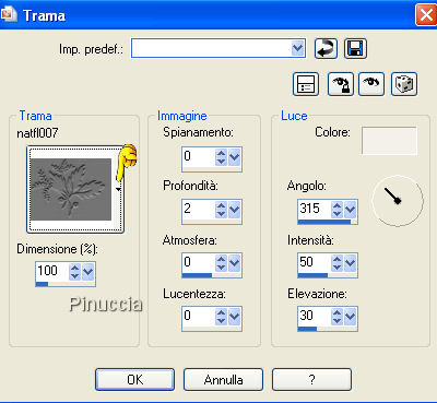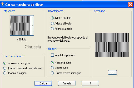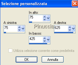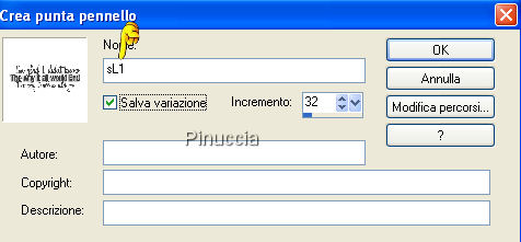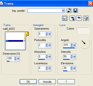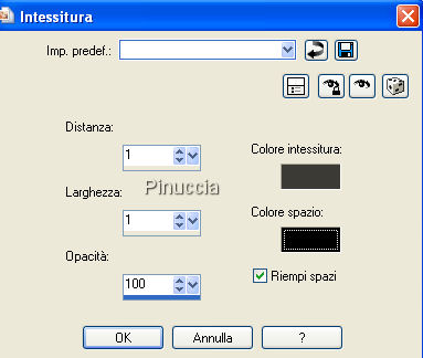 qui puoi trovare qualche risposta ai tuoi dubbi. Se l'argomento che ti interessa non è presente, ti prego di segnalarmelo. Occorrente: Materiale qui Il tube è di Katussia. Il mist è di Isa di Mayflower. Il tube del secondo esempio è di Suzi Sgai. Il materiale scrap è di JoluvsDogs. La maschera è di MS Kris Metti la maschera nella cartella Maschere e la trama nella cartella Trame. Apri il resto del materiale in PSP. Imposta il colore di primo piano con il nero (#000000), e il colore di sfondo con il rosso #9b0309. Apri una nuova immagine trasparente 700 x 500 pixels, e riempila con il nero.Livelli>Nuovo livello raster. Riempi il nuovo livello con il rosso.ricorda che, per riempire con il colore di sfondo, devi cliccare con il tasto destro del mouse. Livelli>Carica/Salva maschera>Carica maschera da disco. Cerca e carica la maschera 430-kris, inverti trasparenza non selezionato. ![]() Livelli>Unisci>Unisci gruppo. Immagine>Rifletti. Livelli>Nuovo livello raster. Attiva lo strumento Selezione ,e clicca sull'icona Selezione personalizzata ,quindi imposta i seguenti settaggi: ![]() Riempi la selezione con il rosso.Apri il tube con il paesaggio: "IoM_Graphics_Cityscapes", e vai a Modifica>Copia. Torna al tuo lavoro e vai a Modifica>Incolla>Incolla nella selezione. Selezione>Modifica>Contrai, di 10 pixels. Selezione>Modifica>Seleziona bordature selezione, 10 pixels, entrambi i lati, antialias. ![]() Effetti>effetti 3D>Sfalsa ombra, con i seguenti settaggi, colore nero. ![]() Effetti>effetti di trama>Trama, apri il menu cliccando sulla freccia a fianco del box, e cerca la trama Naftl b033. ![]() Selezione>Nessuna selezione. Apri scraptube25, e vai a Modifica>Copia. Torna al tuo lavoro e vai a Modifica>Incolla>Incolla come nuovo livello. Sposta il tube in alto, vedi il mio esempio.![]() Livelli>Disponi>Sposta giù. Livelli>Duplica. Immagine>Capovolgi. Attiva il livello superiore. Apri il tube "Katussia bKe0194", e vai a Modifica>Copia. Torna al tuo lavoro e vai a Modifica>Incolla>Incolla come nuovo livello. Sposta il tube a destra.Effetti>Effetti 3D>sfalsa ombra, con i settaggi precedenti. Apri Tekst SL1. File>Esporta>Pennello personalizzato: assegna un nome al pennello e clicca ok. ![]() Attiva lo strumento Pennello ![]() cerca e selezione il pennello che hai appena esportato, e applicalo sull'immagine cliccando con il tasto sinistro del mouse per usare il colore nero di primo piano. Apri il tube "2008", e vai a Modifica>Copia. Torna al tuo lavoro e vai a Modifica>Incolla>Incolla come nuovo livello. Sposta il numero a sinistra.Livelli>Unisci>Unisci tutto. Immagine>Aggiungi bordatura, 10 pixels, simmetriche, con il colore bianco. Seleziona il bordo con la bacchetta magica ![]() ![]() Riempi la selezione con il colore rosso.Effetti>Effetti di trama>Intessitura: ![]() Selezione>Nessuna selezione. Immagine>Aggiungi bordatura, 3 pixels, simmetriche, con il colore bianco. Seleziona il bordo con la bacchetta magica ![]() Imposta il colore di primo piano su Motivi, e seleziona un motivo argento. Riempi la selezione con il motivo argento.Selezione>Nessuna selezione. Immagine>Aggiungi bordatura, 30 pixels, simmetriche, con il colore rosso. Apri il tube "Happy newyear rand" e vai a Modifica>copia. Torna al tuo lavoro e vai a Modifica>Incolla>Incolla come nuovo livello, ed è già correttamente posizionato. Se vuoi seguire l'esempio sotto, non aggiungere il tube Happy New Year, ma seleziona il bordo con la bacchetta magica .Effetti>Effetti di trama>Trama: cerca e seleziona la trama natfl007: ![]() Selezione>Nessuna selezione. Aggiungi il tuo nome e/o il tuo watermark. Per il mio testo ho usato il font qui, dimensione 48. ![]() ![]() ![]() ![]() Se hai problemi o dubbi, o trovi un link non funzionante, o anche soltanto per un saluto, scrivimi. 3 Dicembre 2007 |