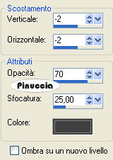qui puoi trovare qualche risposta ai tuoi dubbi. Se l'argomento che ti interessa non è presente, ti prego di segnalarmelo. Occorrente: Materiale qui Il tube è di Colombe, Wordart è di Scrappy Expressions. Apri tutto il materiale in PSP. Apri il file di sfondo "0074". Duplicalo cliccando sulla tastiera la combinazione di tasti shift(maiuscola)+D, e chiudi l'originale. La copia sarà l'area del tuo lavoro. Attiva Beauty-face e vai a Modifica>Copia. Torna al tuo lavoro e vai a Modifica>Incolla>Incolla come nuovo livello. Sposta il tube a sinistra.Effetti>Effetti 3D>Sfalsa ombra, con i seguenti settaggi, colore nero: ![]() Livelli>Unisci>Unisci tutto. Scegli due colori dal tube: uno scuro come colore di primo piano, e uno chiaro come colore di sfondo. Immagine>Aggiungi bordatura, 1 pixel, simmetriche, con il colore scuro di primo piano. Immagine>Aggiungi bordatura, 15 pixels, simmetriche, con il colore chiaro di sfondo. Seleziona questo bordo con la bacchetta magica ![]() ![]() Effetti>effetti di trama>Veneziana: ![]() Effetti>Effetti 3D>Sfalsa ombra, con i settaggi precedenti. Selezione>Nessuna selezione. Immagine>Aggiungi bordatura, 1 pixel, simmetriche, con il colore scuro. Immagine>Aggiungi bordatura, 30 pixels, simmetriche, con il colore chiaro. Attiva l'angolo "SnakeCornerfractal" e vai a Modifica>Copia. Torna al tuo lavoro e vai a Modifica>Incolla>Incolla come nuovo livello. Spostalo in basso a destra.Effetti>Effetti 3D>Sfalsa ombra, con i settaggi precedenti. Attiva il file di testo "SE kindness WordArt" e vai a Modifica>Copia. Torna al tuo lavoro e vai a Modifica>Incolla>Incolla come nuovo livello. Posiziona il testo in alto a destra, o dove preferisci.Livelli>Unisci>Unisci tutto. Immagine>Aggiungi bordatura, 1 pixel, simmetriche, con il colore scuro. Aggiungi il tuo nome e/o il tuo watermark e salva in formato jpg. Per il mio testo ho usato il font AltastGreeting, dimensione 48. Se vuoi usare un altro tube con un altro colore, dovrai colorizzare l'immagine di sfondo: Regola>Saturazione e tonalità>Viraggio (sul viraggio, vedi qui). ![]() ![]() Se hai problemi o dubbi, o trovi un link non funzionante, o anche soltanto per un saluto, scrivimi. 14 Gennaio 2008 ![]()