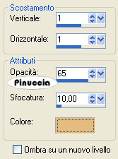 qui puoi trovare qualche risposta ai tuoi dubbi. Se l'argomento che ti interessa non è presente, ti prego di segnalarmelo. Occorrente: Materiale qui Apri tutto il materiale in PSP. Apri una nuova immagine trasparente 700 x 500 pixels. Imposta il colore di primo piano con #e5bc80. Riempi l'immagine trasparente con il colore di primo piano.Livelli>Nuovo livello raster. Selezione>Seleziona tutto. Attiva Mystical Morning e vai a Modifica>Copia. Torna al tuo lavoro e vai a Modifica>Incolla nella selezione. Selezione>Deseleziona. Cambia la modalità di miscelatura di questo livello in Luminanza (esistente). Attiva il tube JHanne, e vai a Modifica>copia. Torna al tuo lavoro e vai a Modifica>Incolla come nuovo livello. Sposta il tube in basso a sinistra.Livelli>Unisci>Unisci tutto. Immagine>Aggiungi bordatura, 15 pixels, simmetriche, con il colore bianco o con un colore a scelta (io ho usato #e5bc80). Immagine>Aggiungi bordatura, 40 pixels, simmetriche, con il colore nero. Seleziona il bordo bianco con la bacchetta magica ![]() ![]() Selezione>inverti. Effetti>Effetti 3D>Sfalsa ombra, con i seguenti settaggi, colore nero: ![]() Selezione>Deseleziona. Attiva il tube bow-tendresse, e vai a Modifica>Copia. Torna al tuo lavoro e vai a Modifica>Incolla come nuovo livello. Posizionalo a destra dal bordo superiore a quello inferiore.Effetti>Effetti 3D>sfalsa ombra, con i settaggi precedenti. Apri wordart-moments of gold. File>Esporta>Pennello personalizzato, scrivi un nome e clicca ok. Livelli>Nuovo livello raster. Attiva lo strumento Pennello ![]() Cerca e seleziona il pennello che hai appena salvato e applicalo con il colore #e5bc80. Posizionalo dovre preferisci, o come nel mio esempio.Attiva il tube tree e vai a Modifica>Copia. Torna al tuo lavoro e vai a Modifica>Incolla come nuovo livello. Spostalo in basso a sinistra, vedi il mio esempio.Effetti>Effetti 3D>Sfalsa ombra, con i settaggi precedenti, ma con il colore dell'ombra #e5bc80. ![]() Livelli>Unisci>Unisci tutto. Aggiungi il tuo nome e/o il tuo watermark. Per il mio testo ho usato il font ValentinaJF, dimensione 48. Variante con il bordo colorato. ![]() ![]() Se hai problemi o dubbi, o trovi un link non funzionante, o anche soltanto per un saluto, scrivimi. 4 Aprile 2008 |
