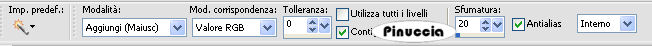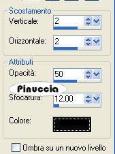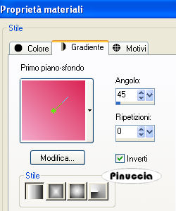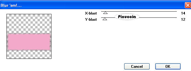 qui puoi trovare qualche risposta ai tuoi dubbi. Se l'argomento che ti interessa non è presente, ti prego di segnalarmelo. Occorrente: Materiale qui Filtro: Toadies - Blur'em qui Metti il pennello nella cartella Pennelli. Attenzione, il pennello è composto da due files che non devono essere separati. Vedi alcuni appunti sui pennelli qui. Apri tutto il materiale in PSP. Apri una nuova immagine BIANCA 600 x 600 pixels. Attiva la cornice "KMILL Frame olal", e vai a Modifica>copia. Torna alla tua immagine bianca e vai a Modifica>Incolla come nuovo livello. Attiva lo strumento Bacchetta magica , sfumatura 20:![]() e clicca all'interno della cornice per selezionarlo. Attiva "sand-dunes" e vai a Modifica>copia. Torna al tuo lavoro e vai a Modifica>Incolla nella selezione. Selezione>Deseleziona. Effetti>Effetti 3D>Sfalsa ombra, con i seguenti settaggi, colore nero: ![]() Attiva il livello di sfondo bianco. Imposta il colore di primo piano con #da2453, e il colore di sfondo con #f3a9ca (o scegli due colori dal tuo tube). Passa il colore di primo piano a Gradiente di primo piano/sfondo, con i seguenti settaggi: ![]() Attiva lo strumento Forme predefinite , rettangolo e traccia un rettangolo,come nell'esempio. ![]() Livelli>Converti in livello raster. Effetti>Plugins>Toadies - Blur'em: ![]() Attiva il livello superiore. Attiva il tuo tube e vai a Modifica>copia. Torna al tuo lavoro e vai a Modifica>Incolla come nuovo livello. Spostalo a sinistra.Effetti>Effetti 3D>Sfalsa ombra, con i settaggi precedenti. Attiva uno dei due fiori, e vai a Modifica>copia. Torna al tuo lavoro e vai a Modifica>Incolla come nuovo livello. Spostalo a destra.Effetti>Effetti 3D>Sfalsa ombra, con i settaggi precedenti. Attiva l'altro fiore, e vai a Modifica>copia. Torna al tuo lavoro e vai a Modifica>Incolla come nuovo livello. Spostalo sotto l'altro fiore, un po' più in basso.Effetti>Effetti 3D>Sfalsa ombra, con i settaggi precedenti. Attiva il livello di sfondo bianco. Attiva lo strumento Pennello ![]() Cerca e seleziona il pennello a-dozi's-stain-03-brush 004, e applicalo a destra e a sinistra. Livelli>Unisci>Unisci tutto. Attiva lo strumento Testo e scrivi il tuo nome.Ho usato il font Rilo, dimensione 150, per la prima lettera del testo, e dimensione 72 per il resto del nome. Effetti>Effetti 3D>sfalsa ombra, con i settaggi precedenti. Aggiungi il tuo watermark e salva in formato jpg. ![]() Se hai problemi o dubbi, o trovi un link non funzionante, o anche soltanto per un saluto, scrivimi. 24 Aprile 2008 |