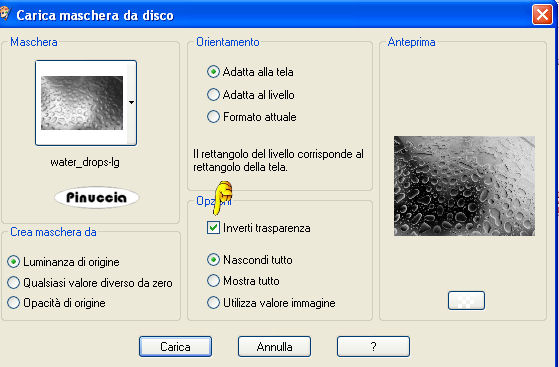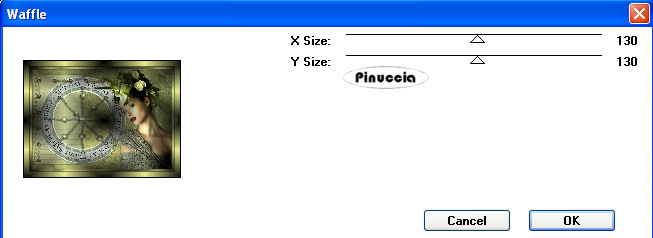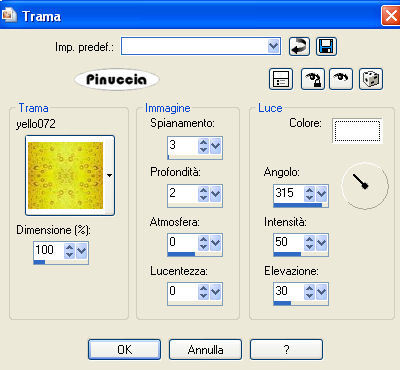 qui puoi trovare qualche risposta ai tuoi dubbi. Se l'argomento che ti interessa non è presente, ti prego di segnalarmelo. Occorrente: Materiale qui. Il bel tube è di @Hanne. Gli elementi scrap sono di Scrappy Expression. Filtro: Greg's Factory Output II qui Metti la maschera nella cartella Maschere. Metti la trama yello072 nella cartella Trame. Apri il resto del materiale in PSP. Apri una nuova immagine trasparente 700 x 500 pixels. Riempi l'immagine trasparente con un colore chiaro scelto dal tube.Il mio #e8ec8d. Livelli>Nuovo livello raster. Selezione>Seleziona tutto. Apri Paper3 e vai a Modifica>Copia. Torna al tuo lavoro e vai a Modifica>Incolla nella selezione. Selezione>Deseleziona. Livelli>Carica/Salva maschera>carica maschera da disco. Cerca e carica la maschera water_drops-lg: ![]() Livelli>Unisci>Unisci gruppo. Apri Journaling e vai a Modifica>Copia. Torna al tuo lavoro e vai a Modifica>Incolla come nuovo livello. Spostalo completamente a sinistra.Effetti>Effetti 3D>Sfalsa ombra, con i seguenti settaggi, colore nero. ![]() Apri Daywheel e vai a Modifica>copia. Torna al tuo lavoro e vai a Modifica>Incolla come nuovo livello. Spostalo a sinistra, in modo che la carta si trovi esattamente a metà della ruota.![]() Apri PaperAccent e vai a Modifica>Copia. Torna al tuo lavoro e vai a Modifica>Incolla come nuovo livello. Sposta a sinistra.Apri il tube della donna e vai a Modifica>Copia. Torna al tuo lavoro e vai a Modifica>Incolla come nuovo livello. Sposta il tube a destra.Effetti>Effetti 3D>Sfalsa ombra, con i settaggi precedenti. Livelli>Unisci>Unisci tutto. Aggiungi il tuo nome e/o il tuo watermark. per il mio esempio ho usato il font Digs My Hart Immagine>Aggiungi bordatura, 3 pixels, simmetriche, con il colore #767c50. Immagine>Aggiungi bordatura, 10 pixels, simmetriche, con il colore #e8ec8d. Seleziona il bordo chiaro con la bacchetta magica ![]() ![]() Effetti>Plugins>Greg's Factory Output 2 - Pool Shadow: ![]() Selezione>Deseleziona. Immagine>Aggiungi bordatura, 3 pixels, simmetriche, con il colore #767c50. Immagine>Aggiungi bordatura, 25 pixels, simmetriche, con il colore #e8ec8d. Seleziona questo bordo con la bacchetta magica ![]() Effetti>Plugins>Greg's Factory Output II - Waffle: ![]() Effetti>Effetti di trama>Trama - seleziona la trama Yello072, con i seguenti settaggi: ![]() Selezione>Deseleziona. Per questo esempio ho usato un tube di Lori Rhae. ![]() ![]() Se hai problemi o dubbi, o trovi un link non funzionante, o anche soltanto per un saluto, scrivimi. 9 Ottobre 2008 |