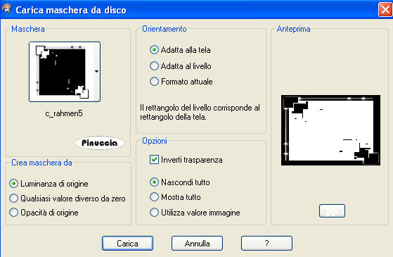 qui puoi trovare qualche risposta ai tuoi dubbi. Se l'argomento che ti interessa non è presente, ti prego di segnalarmelo. Occorrente: Materiale qui. Il tube è di @nn. Metti la maschera nella cartella Maschere, e apri il resto del materiale in PSP. Apri una nuova immagine trasparente 700 x 500 pixels. Scegli un colore scuro dal tuo tube - il mio #3b5123 e impostalo come colore di primo piano, e un colore chiaro - il mio #ccd6b1 - e impostalo come colore di sfondo. Riempi l'immagine trasparente con il colore di primo piano.Livelli>Nuovo livello raster. Riempi il nuovo livello con il colore chiaro di sfondo.Livelli>Carica/Salva maschera>Carica maschera da disco. Cerca e carica la maschera c_rahmen5: ![]() Effetti>Effetti di bordo>Aumenta. Livelli>Unisci>Unisci gruppo. Effetti>Effetti 3D>Sfalsa ombra, con i seguenti settaggi, colore nero. ![]() Apri -a-time-piece- e vai a Modifica>copia. Torna al tuo lavoro e vai a Modifica>Incolla come nuovo livello. Abbassa l'opacità di questo livello al 50%. Apri il tube della donna e vai a Modifica>copia. Torna al tuo lavoro e vai a Modifica>Incolla come nuovo livello. Sposta il tube a sinistra.Effetti>Effetti 3D>Sfalsa ombra, con i settaggi precedenti. Apri il file con il testo e vai a Modifica>Copia. Torna al tuo lavoro e vai a Modifica>Incolla come nuovo livello. Sposta il testo a destra.Effetti>Effetti 3D>Sfalsa ombra, con i settaggi precedenti. Livelli>Unisci>Unisci tutto. Aggiungi il tuo nome e/o il tuo watermark. Per il mio testo ho usato il font Vivaldi. ![]() ![]() Se hai problemi o dubbi, o trovi un link non funzionante, o anche soltanto per un saluto, scrivimi. 2 Ottobre 2008 |