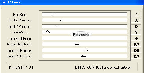 qui puoi trovare qualche risposta ai tuoi dubbi. Se l'argomento che ti interessa non è presente, ti prego di segnalarmelo. Occorrente: Materiale qui I tube è di Azyzam Il tube per l'esempio in fondo al tutorial è di Sdmk Il materiale scrap è di Moineaux Filtri (servono soltanto per il bordo): Greg's Factory output 2 qui Krusty's FX vol. III 1.0 qui Apri una nuova immagine trasparente 700 x 500 pixels. Selezione>Seleziona tutto. Apri tendresse (8) e vai a Modifica>Copia. Torna al tuo lavoro e vai a Modifica>Incolla nella selezione. Mantieni selezionato. Livelli>Nuovo livello raster. Apri Tendress(5) e vai a Modifica>Copia. Torna al tuo lavoro e vai a Modifica>Incolla nella selezione. Selezione>Deseleziona. Effetti>Effetti 3D>Sfalsa ombra, con i seguenti settaggi, colore nero ![]() Attiva il livello inferiore. Livelli>Duplica. Livelli>Disponi>Porta in alto. Immagine>Ridimensiona, all'85%, tutti i livelli non selezionato, ricampionamento bicubica. ![]() Effetti>Effetti 3D>Sfalsa ombra, con i settaggi precedenti. Apri tendresse(53) e vai a Modifica>Copia. Torna al tuo lavoro e vai a Modifica>Incolla come nuovo livello. Sposta il tube a destra.Livelli>Disponi>Sposta giù. Effetti>Effetti 3D>Sfalsa ombra, con i settaggi precedenti. Attiva il livello superiore. Apri il template 11357 e vai a Modifica>Copia. Torna al tuo lavoro e vai a Modifica>Incolla come nuovo livello. Spostalo a destra.Cambia la modalità di miscelatura di questo livello in Luminanza (esistente). Apri tendresse (61) e vai a Modifica>Copia. Torna al tuo lavoro e vai a Modifica>Incolla come nuovo livello. Spostalo nell'angolo a destra.Cambia la modalità di miscelatura di questo livello in luminanza (esistente). Apri il tube della donna e vai a Modifica>Copia. Torna al tuo lavoro e vai a Modifica>Incolla come nuovo livello. Immagine>Ridimensiona, al 75%, tutti i livelli non selezionato. Spostalo a sinistra contro il bordo della carta interna.![]() Effetti>Effetti 3D>Sfalsa ombra, con i settaggi precedenti. Apri tendresse (30) e vai a Modifica>Copia. Torna al tuo lavoro e vai a Modifica>Incolla come nuovo livello. Spostalo a sinistra.Apri tendresse (34) e vai a Modifica>Copia. Torna al tuo lavoro e vai a Modifica>Incolla come nuovo livello. Spostalo in basso a sinistra.Trascina questo livello sotto il livello Raster 3. ![]() Attiva il livello superiore. Apri tendresse (57) e vai a Modifica>Copia. Torna al tuo lavoro e vai a Modifica>Incolla come nuovo livello. Spostalo in alto a destra.Attiva lo strumento Gomma ![]() e cancella un pezzetto della spilla, per dare l'impressione che sia infilata nella carta. puoi usare la gomma o selezionare la parte e poi premere sulla tastiera il tasto CANC. ![]() Aggiungi il tuo watermark e/o il nome o un testo. Per il mio testo ho usato il font Andalus. Livelli>Unisci>Unisci tutto. Immagine>Aggiungi bordatura, 1 pixel, simmetriche, con il colore #edeeef. Immagine>Aggiungi bordatura, 30 pixels, simmetriche, con il colore #9e938f. Seleziona questo bordo con la bacchetta magica ![]() ![]() Effetti>Plugins>Krusty's FX vol. III - Grid mover. ![]() Effetti>Plugins>Greg's Factory Output II - Pool Shadow: ![]() Selezione>inverti. Effetti>Effetti 3D>sfalsa ombra, con i settaggi precedenti. Selezione>Deseleziona. ![]() ![]() Se hai problemi o dubbi, o trovi un link non funzionante, o anche soltanto per un saluto, scrivimi. 18 Aprile 2008 |