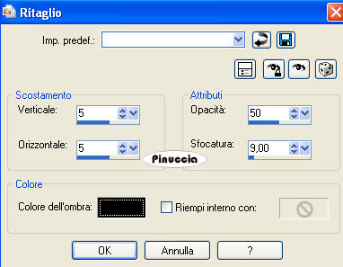 qui puoi trovare qualche risposta ai tuoi dubbi. Se l'argomento che ti interessa non è presente, ti prego di segnalarmelo. Occorrente: Materiale qui I tubes sono di Brigitte e Isharimal Apri i tubes in PSP e metti i pennelli nella cartella dei pennelli. fai attenzione: il pennello è composto da due files, che non devono essere separati. Trovi alcuni appunti sui pennelli qui Scegli due colori dal tube. Io ho scelto il rosso scuro #a80d02 e il giallo scuro #d79f01. Apri una nuova immagine trasparente 700 x 500 pixels, e riempila con il colore rosso.Selezione>Seleziona tutto. Attiva "Overlay_AgedLinenGrunge" e vai a Modifica>Copia. Non chiuderlo, perchè ti servirà ancora. Torna al tuo lavoro e vai a Modifica>Incolla>Incolla nella selezione. Selezione>Nessuna selezione. Attiva il tube del fiore "Mtm Bloemen_175-small" e vai a Modifica>Copia. Torna al tuo lavoro e vai a Modifica>Incolla>Incolla come nuovo livello. Sposta questo tube a sinistra.Attiva il tube della cornice "Translucentframe" e vai a Modifica>copia. Torna al tuo lavoro e vai a Modifica>Incolla>Incolla come nuovo livello. Sposta la cornice sopra il fiore, vedi il mio esempio.![]() Regola>Saturazione e tonalità>Viraggio: ![]() Attiva il tube "Isharimal_woman03" e vai a Modifica>Copia. Torna al tuo lavoro e vai a Modifica>Incolla>Incolla come nuovo livello. Sposta questo tube a destra.Effetti>Effetti 3D>Sfalsa ombra, con i seguenti settaggi, colore nero: ![]() Livelli>Unisci>Unisci tutto. Immagine>Aggiungi bordatura, 2 pixels, simmetriche, con il colore giallo. Immagine>Aggiungi bordatura, 30 pixels, simmetriche, con il colore rosso. Seleziona questo bordo con la bacchetta magica ![]() ![]() Attiva nuovamente "Overlay_AgedLinenGrunge" e vai a Modifica>Copia. Torna al tuo lavoro e vai a Modifica>Incolla>Incolla nella selezione. Selezione>Inverti. Effetti>Effetti 3D>Ritaglio: ![]() Ripeti l'Effetto Ritaglio, ma cambiando verticale e orizzontale a -5. Selezione>Inverti. Attiva lo strumento Pennello ![]() cerca e seleziona il pennello wlj04squarez02 001. Applica il pennello sugli angoli, cliccando con il tasto destro del mouse, per usare il colore giallo di sfondo. Selezione>Nessuna selezione. Aggiungi il tuo nome. Io ho usato il font fornito con il materiale, dimensione 72, crea come vettore. Dopo aver scritto il testo vai a Livelli>converti in livello raster. Effetti>Effetti 3D>Sfalsa ombra, con i seguenti settaggi: ![]() Aggiungi, se vuoi, il tuo watermark. Livelli>Unisci>Unisci tutto e salva in formato jpg. ![]() Se hai problemi o dubbi, o trovi un link non funzionante, o anche soltanto per un saluto, scrivimi. 31 Agosto 2007 |
