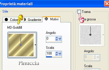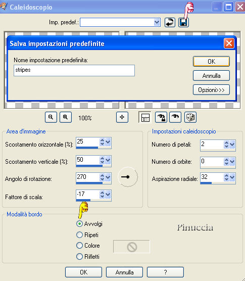 qui puoi trovare qualche risposta ai tuoi dubbi. Se l'argomento che ti interessa non è presente, ti prego di segnalarmelo. Occorrente: PSP. versione di prova Materiale: qui Filtro di Dragonfly: Sinedot II qui Scompatta il filtro nella cartella Plugins. Chiudi e riapri il programma, altrimenti il filtro non funzionerà. Apri tutte le immagini in PSP. Ricordati di salvare spesso. Apri una della immagini dei fiori contenute nello zip (in totale sono 5). Io ho fatto il tutorial con i fiori rossi ma qualsiasi altro colore va bene. Tutto quello che devi fare è regolare i colori del gradiente per adattarli all'immagine. Imposta il colore di primo piano con #963939. Imposta il colore di sfondo con #430e12. Passa il colore di primo piano a gradiente di primo piano/sfondo, con i seguenti settaggi, trame non selezionato (manina rossa). ![]() Adesso passa il colore di sfondo a Motivi (pattern) e cerca il motivo MD-Goldfill.jpg. trame non selezionato (manina rossa). ![]() Immagine>Aggiungi bordatura, 3 pixels, simmetriche, con il colore bianco. Con la bacchetta magica (sfumatura 0, tolleranza 15), seleziona il bordo bianco.Riempi la selezione cliccando con il tasto destro del mouse (motivo oro).Selezione>Nessuna selezione (deseleziona sempre, dopo aver riempito i bordi). Immagine>Aggiungi bordatura, 3 pixels, simmetriche, con il colore bianco. Con la bacchetta magica , seleziona il bordo bianco.Riempi la selezione con il gradiente.Immagine>Aggiungi bordatura, 3 pixels, simmetriche, con il colore bianco. Con la bacchetta magica , seleziona il bordo bianco.Riempi la selezione cliccando con il tasto destro del mouse (motivo oro).Immagine>Aggiungi bordatura, 15 pixels, simmetriche, con il colore bianco. Con la bacchetta magica , seleziona il bordo bianco.Riempi la selezione con il gradiente.Effetti>Effetti di riflesso>Caleidoscopio: Usa l'impostazione predefinita Stripes. Se non la trovi nella lista delle Impostazioni, puoi farla da sola. Queste sono le impostazioni: Quando hai fatto, salva le impostazioni con il nome Stripes (manina rossa). ![]() Immagine>Aggiungi bordatura, 3 pixels, simmetriche, con il colore bianco. Con la bacchetta magica , seleziona il bordo bianco.Riempi la selezione cliccando con il tasto destro del mouse (motivo oro).Immagine>Aggiungi bordatura, 3 pixels, simmetriche, con il colore bianco. Con la bacchetta magica , seleziona il bordo bianco.Riempi la selezione con il gradiente.Immagine>Aggiungi bordatura, 3 pixels, simmetriche, con il colore bianco. Con la bacchetta magica , seleziona il bordo bianco.Riempi la selezione cliccando con il tasto destro del mouse (motivo oro).Immagine>Aggiungi bordatura, 35 pixels, simmetriche, con il colore bianco. Con la bacchetta magica , seleziona il bordo bianco.Riempi la selezione con il gradiente.Effetti>Plugins>Dragonfly / Sinedots II. Metti i settaggi come nella schermata. Non saltare niente. Colore #400000. Se usi un altro colore per la tua cornice, devi regolare anche il colore del filtro. ![]() Se vuoi, puoi salvare i settaggi per un uso futuro: clicca su Save (1), assegna un nome alle impostazioni (2) e clicca ok (3). ![]() e i settaggi saranno disponibili nella cartella del filtro con il nome che hai scelto. ![]() Per ritrovarli, dopo aver aperto il filtro, clicca sul piccolo triangolo per aprire il menu a tendina, , e li vedrai. ![]() Livelli>Nuovo livello raster. Riempi il livello cliccando con il tasto destro del mouse (motivo oro).Nella paletta dei livelli cambia la modalità di miscelatura di questo livello in Dissolvi e abbassa l'opacità al 4%. ![]() Livelli>Unisci>Unisci tutto (appiattisci). Immagine>Aggiungi bordatura, 3 pixels, simmetriche, con il colore bianco. Questa volta non puoi usare la bacchetta magica per selezionare il bordo a causa dei riflessi creati dalla miscelatura del livello Dissolvi. Quindi fai così: Selezione>Seleziona tutto. Selezione>Modifica>Contrai, di 3 pixels. Selezione>Inverti. Riempi la selezione cliccando con il tasto destro del mouse (motivo oro).Immagine>Aggiungi bordatura, 3 pixels, simmetriche, con il bordo bianco. Con la bacchetta magica , seleziona il bordo bianco.Riempi la selezione con il gradiente.Immagine>Aggiungi bordatura, 3 pixels, simmetriche, con il colore bianco. Con la bacchetta magica , seleziona il bordo bianco.Riempi la selezione cliccando con il tasto destro del mouse (motivo oro).Selezione>Seleziona tutto. Selezione>Modifica>Contrai, di 15 pixels. Effetti>Effetti 3D>Sfalsa ombra, con i seguenti settaggi, colore nero: ![]() Ripeti l'Effetto Sfalsa ombra, ma cambiando verticale e orizzontale a -2. Selezione>Nessuna selezione. Apri il file MD-Soul-Corner.psp e vai a Modifica>Copia. Torna al tuo lavoro e vai a Modifica>Incolla>Incolla come nuovo livello. Spostalo nell'angolo in alto a sinistra, in modo che tocchi l'ombra.![]() Effetti>Effetti 3D>Sfalsa ombra, con i seguenti settaggi: ![]() Livelli>Duplica. Immagine>Rifletti. Chiudi il livello di sfondo. Livelli>Unisci>Unisci visibile. Livelli>Duplica. Immagine>Capovolgi. Riapri il livello di sfondo. Livelli>Unisci>Unisci tutto. Questa cornice può essere fatta anche in argento. Anche gli elementi per la cornice in argento sono nello zip. ![]() ![]() Se hai problemi o dubbi, o trovi un link non funzionante, o anche soltanto per dirmi che ti è piaciuto, scrivimi. Luglio 2006 |