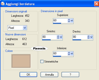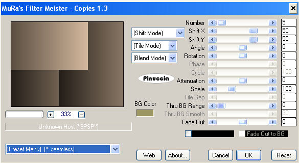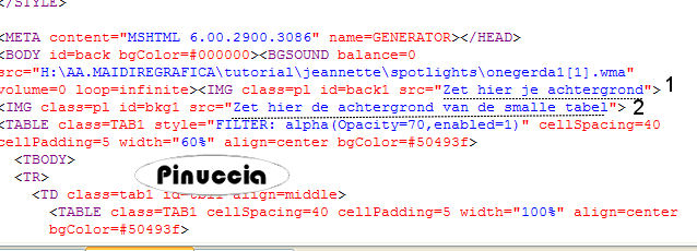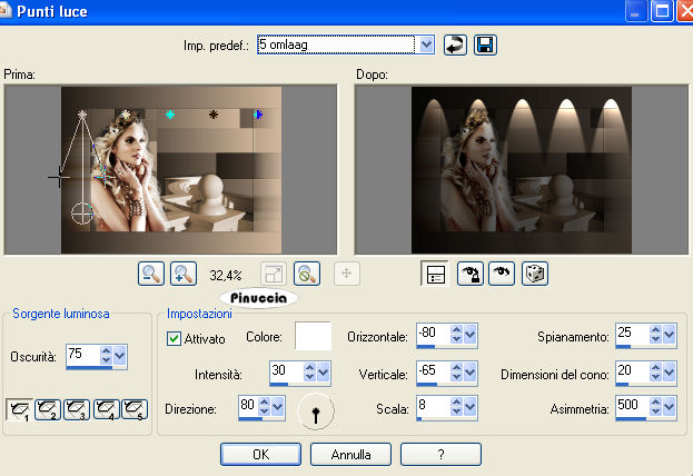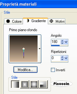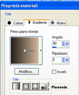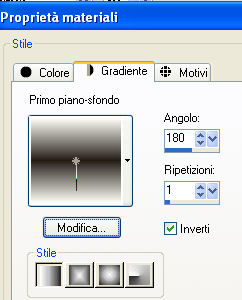 qui puoi trovare qualche risposta ai tuoi dubbi. Se l'argomento che ti interessa non è presente, ti prego di segnalarmelo. Materiale qui Il tube della donna è di Filly. L'ornamento è di BodyCreations. Metti il file "Preset_Lights5 omlaag" nella cartella Impostazioni predefinite di PSP. Filtri: Mura's Meister qui Adjust Variations qui Imposta il colore di primo piano con #231D17, e il colore di sfondo con achtergrond op #D3B89D. Passa il colore di primo piano a Gradiente, con i seguenti settaggi: ![]() 1. Apri una nuova immagine trasparente 660 x 500 pixels, e riempila con il gradiente.2. Effetti>effetti di bordo>Aumenta di più. 3. Apri il tube Balcon e vai a Modifica>Copia. Torna al tuo lavoro e vai a Modifica>Incolla>Incolla come nuovo livello. Sposta nell'angolo in basso a destra.4. Regola>Saturazione e tonalità>Viraggio: ![]() 5. Effetti>Effetti 3D>Sfalsa ombra, con i seguenti settaggi: ![]() 6. Apri il tube della donna e vai a Modifica>Copia. Torna al tuo lavoro e vai a Modifica>Incolla come nuovo livello. Spostalo a sinistra.7. Nella paletta dei livelli clicca sul livello dello sfondo (deve diventare blu). ![]() 8. Effetti>Plugins>Mura's Meister - Copies con i seguenti settaggi: ![]() 9. Ripeti l'Effetto con gli stessi settaggi, 3 o 4 volte, finchè non sei soddisfatto del risultato. 10. Regola>Messa a fuoco>Metti a fuoco, 2 volte. 11. Livelli>Unisci>Unisci tutto. 12. Immagine>Ridimensiona, a 450 pixels di larghezza, mantieni proporzioni selezionato. 13. Immagine>Aggiungi bordatura, 1 pixel, simmetriche, con il colore di primo piano. 14. Immagine>Aggiungi bordatura, simmetriche non selezionato, con il colore di sfondo. ![]() 15. Seleziona il bordo con la bacchetta magica ,e riempila con il gradiente.16. Effetti>Effetti di distorsione>Vento, da destra, intensità 100. ![]() Ripeti l'Effetto Vento 100 da sinistra. 17. Regola>Messa a fuoco>Metti a fuoco, 2 volte. Selezione>Nessuna selezione. 18. Effetti>Effetti di illuminazione>Punti luce: Apri il menu delle impostazioni cliccando sulla freccia a fianco del box, cerca e seleziona il preset lights 5 omlaag: ![]() ![]() 19. Effetti>Plugins>Adjust Variation, clicca una volta su Lighter. 20. Apri il tube BC-balet, e vai a Modifica>Copia. Torna al tuo lavoro e vai a Modifica>Incolla>Incolla come nuovo livello. Sposta il tube a destra.Livelli>Unisci>Unisci tutto. Regola>Messa a fuoco>Metti a fuoco, 2 o 3 volte. 21. Cambia i settaggi del gradiente, portando l'angolo a 180, il resto va bene come impostato all'inizio. ![]() 22. Attiva lo strumento Selezione , rettangolo,e traccia un piccolo rettangolo in alto per tutta la larghezza dell'immagine. 23. Livelli>Nuovo livello raster. Riempi con il gradiente.24. Effetti>Effetti 3D>Sfalsa ombra, con i seguenti settaggi. ![]() Regola>Messa a fuoco>Metti a fuoco. 25. Selezione>nessuna selezione. Livelli>Unisci>Unisci tutto. 26. Apri il tube "knopje" e vai a Modifica>Copia. Torna al tuo lavoro e vai a Modifica>Incolla>Incolla come nuovo livello. Spostalo sotto il primo cono di luce.Livelli>Duplica, e ripeti 4 volte, e sposta ogni bottone sotto ogni cono di luce. 27. Immagine>Aggiungi bordatura, 1 pixel, simmetriche, con il colore di primo piano. L'immagine è finita. Se vuoi realizzare lo script di Jeannette, ti servono anche due immagini di sfondo. Indicazioni per gli sfondi: Questo è quello che ho fatto io. Naturalmente, puoi scegliere di creare altri sfondi, o cambiare le impostazioni come preferisci. primo sfondo: apri una immagine 150x150 pixels e riempila con il gradiente. Effetti>Effetti di bordo>Aumenta. Effetti>Plugins>Mura's Meister - Copies, tre o 4 volte. Regola>Messa a fuoco>Metti a fuoco, 3 o 4 volte. Salva in formato jpg come sfondo1. secondo sfondo: apri una immagine 150x150 pixels e riempila con il gradiente così impostato: ![]() Effetti di bordo>Aumenta di più e salva in formato jpg come sfondo2. Per eseguire lo script Apri lo script di Jeannette che trovi qui, e segui i preliminari descritti alla fine di questo tutorial, fino all'inserimento dello sfondo-suono. Dopo aver inserito lo sfondo-suono, dovrai indicare allo script dove trovare le immagini. Clicca su Origine e identifica i punti di inserimento dei vari elementi dello script. Se hai messo tutti i file in una cartella, il percorso del suono ti servirà da guida per l'inserimento degli altri files: ti basterà cambiare l'ultima parte: il nome e l'estensione. Nella schermata sotto sono indicati i punti in cui dovrai inserire, tra le virgolette, il percorso delle due immagini di sfondo, e dell'immagine che hai duplicato al punto 21 e ridotto a 300x300 pixels. 1. Qui inserisci lo sfondo1. 2. Qui inserisci lo sfondo2, che servirà per le tabelle laterali. ![]() Nella schermata sotto è indicato il punto in cui dovrai inserire il percorso dell'immagine principale. ![]() Ricorda che, contemporaneamente, puoi controllare il risultato andando su Anteprima. fai molta attenzione alle estensioni dei files e alle maiuscole-minuscole, che devono essere corrette, altrimenti lo script non troverà le immagini da inserire Clicca adesso sulla linguetta Modifica, per aggiungere il testo. clicca due volte all'interno del riquadro. Apparirà la cornice che ti dà il via libera per sostituire il testo esistente e aggiungere il tuo. Quando hai finito, clicca all'esterno e la cornice sparirà. Il tuo messaggio con lo script è pronto per il tasto Invia. Se non vuoi spedirlo e vuoi soltanto tenerlo per te, vai a File>Salva con nome e mettilo in una cartella a tua scelta. Ricordati, però, che quando vorrai rivedere lo script, i files devono trovarsi nello stesso posto. Se nel frattempo li avrai spostati, vedrai soltanto delle crocette rosse. Avvertimento: non devi preoccuparti se in Modifica non vedrai il messaggio come dovrebbe essere (per fare questo devi andare in Anteprima). Ricorda ancora che per inviare il messaggio ti devi posizionare su Modifica. ![]() Se hai problemi o dubbi, o trovi un link non funzionante, o anche soltanto per un sal