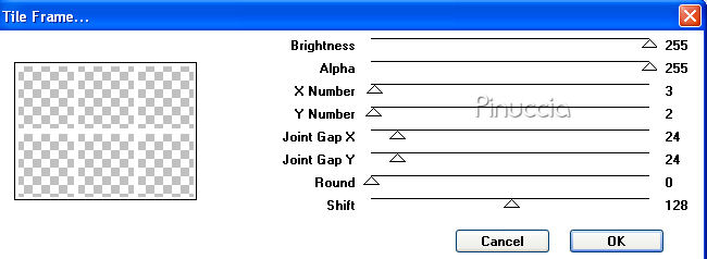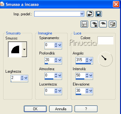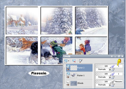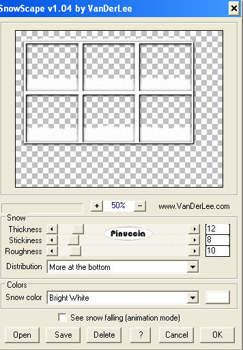 qui puoi trovare qualche risposta ai tuoi dubbi. Se l'argomento che ti interessa non è presente, ti prego di segnalarmelo. Questo tutorial è stato scritto con PSP X, ma può essere eseguito anche con le altre versioni di PSP. Occorrente: Materiale qui Filtri: Muras Seamless-Tile Frame qui VDL Adrenaline Snowscape qui 1. Apri una nuova immagine trasparente 600 x 450 pixels. Selezione>Seleziona tutto. Apri l'immagine Frosty.jpg e vai a Modifica>Copia. Torna alla tua immagine trasparente e vai a Modifica>Incolla nella selezione. Selezione>Deseleziona. Livelli>Nuovo livello raster. Imposta il colore di primo piano con un colore chiaro scelto dalle tue immagini, e riempi la tela con questo colore.Abbassa l'opacità di questo livello al 65%. Immagine>Aggiungi bordatura, 3 pixels, simmetriche, con un colore a tua scelta. Questo sarà il tuo sfondo. Mettilo da parte per il miomento. 2. Apri il paesaggio invernale che hai scelto per eseguire il tutorial. Se necessario, ridimensionalo (Immagine>Ridimensiona...), a circa 500 pixels di larghezza e 300 di altezza. 3. Livelli>Nuovo livello raster. Effetti>Plugins>Mura's Seamless - Tile Frame, con i seguenti settaggi: ![]() 4. Effetti>effetti 3D>Smusso a incasso, con i seguenti settaggi: ![]() Nella paletta dei livelli, tenendo premuto il mouse con il tasto sinistro del mouse su ciascuno dei due livelli, che non devono essere uniti, trascina il livello nella tua immagine di sfondo. Questo posizionerà l'immagine esattamente al centro dello sfondo. ![]() Se ti è più comodo, puoi anche copiare i due livelli con Modifica>Copia, e poi sullo sfondo Modifica>Incolla>Incolla come nuovo livello. Puoi anche spostare l'immagine.In questo caso, per spostare contemporaneamente i due livelli, collegali nella paletta dei livelli. Io l'ho spostata un po' a sinistra. ![]() 5. Attiva il livello con la finestra (Raster 2). Effetti>Effetti 3D>Sfalsa ombra, con i seguenti settaggi: ![]() Rimani posizionato su questo livello. Effetti>Plugins>VDL Adrenaline - Snowscape, con i seguenti settaggi. ![]() la versione del filtro fornita con questo tutorial è la 1.4. Se stai usando la versione precedente, avrai questa schermata. ![]() 6. Apri il tube KaraT3561.psp, e vai a Modifica>Copia. Torna al tuo lavoro e vai a Modifica>Incolla come nuovo livello. Immagine>Ridimensiona, al 66%, tutti i livelli non selezionato. Sposta il tube in basso a destra.7. Apri il tube con le bacche rosse (DLB-11-06-BerriesCones), e vai a Modifica>Copia. Torna al tuo lavoro e vai a Modifica>Incolla come nuovo livello. Immagine>Ridimensiona, al 45%, tutti i livelli non selezionato. Immagine>Capovolgi. Sposta le bacche nell'angolo in alto a sinistra.Attiva lo strumento Testo , scegli un bel font, e scrivi il tuo testo.Effetti>Effetti 3D>Sfalsa ombra, con i settaggi precedenti. 7. Attiva ora nella paletta dei livelli il livello sotto la finestra, il livello del paesaggio invernale (Raster 1). Apri l'immagine sax-5schnee.psp. Vedrai che è composto da 5 livelli. ![]() Di questi cinque livelli, ne userai soltanto 3. 8. Posizionati sul livello Raster 1 e vai a Modifica>Copia. 8. Torna al tuo lavoro. Assicurati di essere sempre posizionato sul livello del paesaggio (Raster 2). Attiva lo strumento Selezione , rettangolo,e seleziona l'area della finestra. ![]() Modifica>Incolla come nuovo livello. Selezione>inverti, e premi sulla tastiera il tasto CANC ,così eliminerai la neve rimasta all'esterno della finestra. Selezione>Deseleziona. Modifica>Copia unione. Apri Animation Shop. Clicca con il tasto destro del mouse sullo spazio vuoto e Incolla come nuova animazione. 8. Torna in PSP. Devi ora annullare tutte le operazioni fatte per incollare il primo livello della neve: questa la sequenza: Modifica>Annulla Azione Deseleziona. Modifica>Annulla azione Annulla selezione. Modifica>Annulla azione inverti selezione. Modifica>Annulla azione Incolla nuovo livello. A questo punto, ti ritroverai con l'area della finestra selezionata. Attiva il file sax-5schnee e posizionati sul secondo livello (Raster 2). Modifica>Copia. Torna al tuo lavoro e vai a Modifica>Incolla come nuovo livello. Selezione>Inverti, e premi sulla tastiera il tasto canc. Selezione>Deseleziona. Modifica>Copia unione. Torna in Animation Shop e vai a Modifica>Incolla>Incolla dopo il fotogramma corrente. 9. Di nuovo in PSP, annulla le ultime operazioni come hai fatto prima, per riavere l'area selezionata. Attiva Sax-5schnee e posizionati sul terzo livello (Raster 3). Modifica>Copia. Torna al tuo lavoro e vai a Modifica>Incolla come nuovo livello. Selezione>Inverti e premi il tasto canc. Selezione>Deseleziona. Modifica>Copia Unione. E per finire in Animation Shop: Modifica>Incolla>Incolla dopo il fotogramma selezionato. E la tua animazione è finita. Controlla il risultato cliccando su Visualizza , e salva in formato gif.![]() Se hai problemi o dubbi, o trovi un link non funzionante,scrivimi 13 Novembre 2007 |