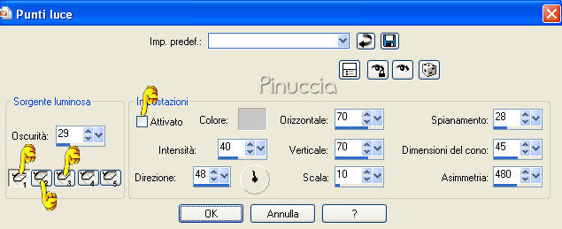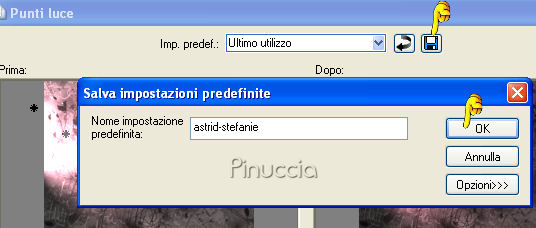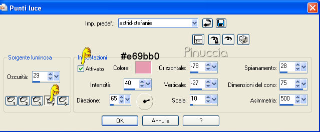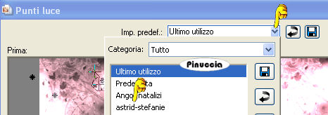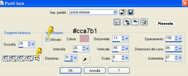 qui puoi trovare qualche risposta ai tuoi dubbi. Se l'argomento che ti interessa non è presente, ti prego di segnalarmelo. Questo tutorial è stato creato con PSP X, ma può essere eseguito anche con le altre versioni di PSP. Un ringraziamento ai creatori del bel materiale che ho ricevuto attraverso varie mailing lists. Per favore, non cambiare il nome dei files e non cancellare il livello del watermark. Occorrente: Materiale qui Filtro: Xero Porcelain XL: qui sul Filtro Xero XL, rilasciato a dicembre 2007, vedi alcuni appunti qui 1. Imposta il colore di primo piano con il nero, e il colore di sfondo con #a4a09e. Apri la maschera "januar_mask", e minimizzala nella tua area di lavoro. 2. Apri una nuova immagine trasparente 700 x 500 pixels, e riempila con il nero.Livelli>Nuovo livello raster. Riempi il nuovo livello con il colore di sfondo.ricorda che, per riempire con il colore di sfondo devi cliccare con il tasto destro del mouse. Livelli>Nuovo livello maschera>Da immagine: apri il menu sotto la finestra di origine, seleziona la maschera "januar_mask", e clicca ok. ![]() Livelli>Unisci>Unisci tutto. 3. Effetti>Effetti di illuminazione>Punti luce. Sono necessari alcuni passaggi. Dovrai cliccare ok soltanto alla fine. Seleziona il punto luce 1 e rimuovi la selezione dalla casellina Attivato. ![]() NON cliccare ok. Seleziona il punto luce 2 e rimuovi la selezione dalla casellina Attivato. Non cliccare ok. Seleziona il punto luce 3 e rimuovi la selezione dalla casellina Attivato. Non cliccare ok. Seleziona il punto luce 4 e imposta i seguenti settaggi, con il colore #e69bb0. ![]() Non cliccare ok. Seleziona il punto luce 5 e imposta i seguenti settaggi, con il colore #cca7b1. Il settaggio della direzione di questo punto luce è 248. In alcune versioni le centinaia non sono visibili. Adesso puoi cliccare ok. ![]() 4. Se vuoi salvare questi settaggi per un uso futuro, clicca sull'icona del floppy (1), e assegna un nome alle impostazioni. ![]() Quando ti serviranno, dovrai aprire il menu delle impostazioni predefinite (2), e troverai nella lista le impostazioni salvate. ![]() 5. Apri Rahmen Gina. Vai alla paletta dei livelli e trascina con il tasto sinistro del mouse questo livello sull'immagine: ![]() e la cornice passerà correttamente sulla tua tag. ![]() 6. Fai la stessa cosa con il tube della donna, trascinando il livello del tube sulla tag: ![]() e il tube sarà correttamente posizionato. ![]() Ripeti con il tube sax_art, ma sposta il testo in alto a sinistra (vedi l'esempio finale).Livelli>Unisci>Unisci tutto. 7. Effetti>Plugins>Xero - Porcelain, con i seguenti settaggi. ![]() Aggiungi il tuo nome e/o il tuo watermark e salva in formato jpg. ![]() Se hai problemi o dubbi, o trovi un link non funzionante, scrivimi 23 Gennaio 2008 |