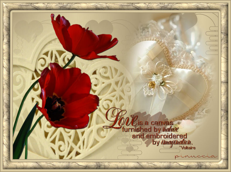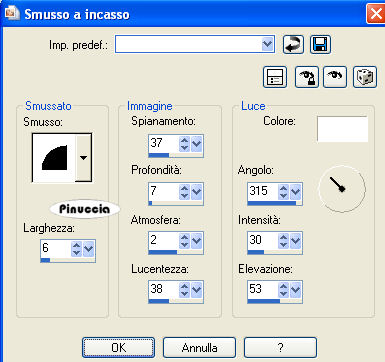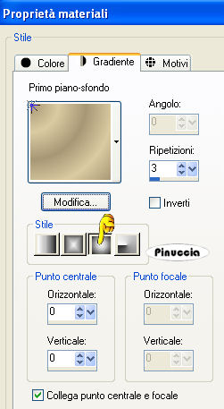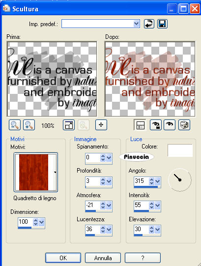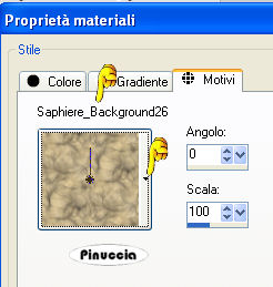 qui puoi trovare qualche risposta ai tuoi dubbi. Se l'argomento che ti interessa non è presente, ti prego di segnalarmelo. Questo tutorial è stato creato con PSP X, ma può essere eseguito anche con le altre versioni di PSP. Un ringraziamento ai creatori del bel materiale che ho ricevuto attraverso varie mailing lists. Per favore, non cambiare il nome dei files e non cancellare il livello del watermark. Occorrente: Materiale qui Esporta il pennello hbgbrush1.001.PspBrush nella cartella Pennelli. Come fare vedi qui Apri il file Saphiere_Background26.jpg e minimizzalo nella tua area di lavoro. 1. Apri una nuova immagine trasparente 700 x 500 pixels. Imposta il colore di primo piano con #a79775, e il colore di sfondo con #dacba2. Passa il colore di primo piano a Gradiente di primo piano/sfondo, con i seguenti settaggi: ![]() Riempi l'immagine trasparente con il gradiente.2. Livelli>Nuovo livello raster. Attiva lo strumento Pennello ![]() cerca e seleziona il pennello hbgbrush1, che hai esportato, e applicalo più volte sull'immagine con il colore di primo piano. 3. Apri chrismist_acc-2842.pspimage, e vai a Modifica>Copia. Torna al tuo lavoro e vai a Modifica>Incolla come nuovo livello. Sposta il tube in alto a destra.Apri chrismist_2404-F.pspimage, e vai a Modifica>Copia. Torna al tuo lavoro e vai a Modifica>Incolla come nuovo livello. Immagine>Rifletti. Attiva lo strumento Puntatore ![]() Deformazione se stai usando PSP 9,e ingrandisci il tube per tutta l'altezza, spostandolo nell'angolo in basso a sinistra. Dovresti avere qualcosa di simile a questo: ![]() vedi qui alcuni appunti sullo strumento Puntatore-Deformazione. 4. Apri il tube "2024 flower 35 AR 821®Alejandra Rosales-11-2-07.pspimage", e vai a Modifica>Copia. Torna al tuo lavoro e vai a Modifica>Incolla come nuovo livello. Sposta il tube a sinistra.Effetti>Effetti 3D>Sfalsa ombra: ![]() 5. Immagine>Aggiungi bordatura, 2 pixels, simmetriche, con il colore scuro. Immagine>Aggiungi bordatura, 40 pixels, simmetriche, con il colore chiaro. Seleziona questo bordo con la bacchetta magica ![]() ![]() 6. Selezione>Modifica>Contrai, di 8 pixels. Livelli>Nuovo livello raster. Passa il colore di primo piano a Motivi. Apri il menu cliccando sulla freccia a fianco del box. Tra i motivi disponibili seleziona Saphiere_Background26 (lo trovi nella lista perchè si trova minimizzato nella tua area di lavoro). ![]() Riempi la selezione con questo motivo.Selezione>Deseleziona. Effetti>Effetti 3D>Smusso a incasso: ![]() Effetti>Effetti 3D>Sfalsa ombra: ![]() Immagine>Aggiungi bordatura, 2 pixels, simmetriche, con il colore scuro. 7. Apri SE_Love_wordART_Quote.psp, e vai a Modifica>Copia. Torna al tuo lavoro e vai a Modifica>Incolla come nuovo livello. Sposta il testo in basso a destra.Effetti>Effetti di trama>Scultura, seleziona la trama Quadretto di legno, con i seguenti settaggi: ![]() Effetti>Effetti 3D>Sfalsa ombra: ![]() Aggiungi il tuo nome e/o il tuo watermark. Livelli>Unisci>Uniscci tutto, e salva in formato jpg. ![]() Se hai problemi o dubbi, o trovi un link non funzionante, scrivimi 31 Gennaio 2008 |