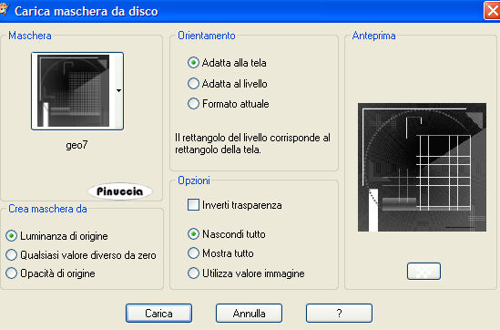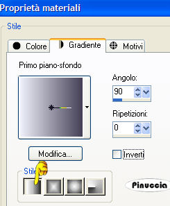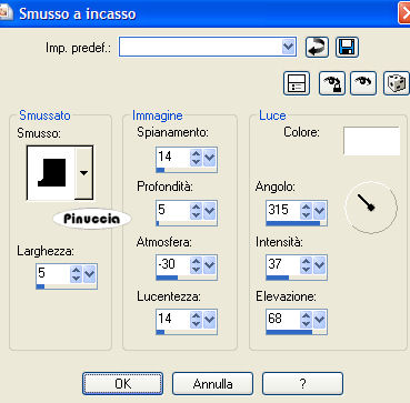 qui puoi trovare qualche risposta ai tuoi dubbi. Se l'argomento che ti interessa non è presente, ti prego di segnalarmelo. Questo tutorial è stato scritto con PSP 9, ma può essere eseguito anche con le altre versioni di PSP. Occorrente: Materiale qui Filtro FM Tile Tools qui Metti la maschera nella cartella Maschere di PSP. Apri i fonts e minimizzali nella tua area di lavoro. Li troverai nella lista dei font disponibili, quando ti serviranno. 1. Apri una nuova immagine trasparente 450 x 450 pixels. Imposta il colore di primo piano con #eef0fa, e il colore di sfondo con #454056. Passa il colore di primo piano a Gradiente di primo piano/sfondo, con i seguenti settaggi: ![]() 2. Livelli>Nuovo livello raster. Riempi questo livello con #454056.poichè il colore è impostato come colore di sfondo, per riempire devi cliccare con il tasto destro del mouse. Livelli>carica/Salva maschera>Carica maschera da disco: cerca e carica la maschera geo7, inverti trasparenza NON selezionato. ![]() Livelli>Unisci>Unisci tutto. Effetti>Plugins>FM Tile Tools - Blend Emboss, con i settaggi standard: ![]() (vedrai in alto un bordino bianco, ma non preoccuparti, proseguendo con il lavoro questo sparirà). 3. Apri il tube MrSunglass e vai a Modifica>Copia. torna al tuo lavoro e vai a Modifica>Incolla>Incolla come nuovo livello. Immagine>Rifletti. Posiziona il tube a destra contro il bordo, in modo che parte del gomito rimanga fuori.Livelli>Duplica. Attiva il livello inferiore del tube (il livello del tube originale, non la copia). Effetti>Effetti di distorsione>Vento, da sinistra, intensità del vento 100. ![]() 4. Apri il tube aftershaveger2 e vai a Modifica>Copia. Torna al tuo lavoro e vai a Modifica>Incolla>Incolla come nuovo livello. Immagine>Ridimensiona, all'80%, tutti i livelli NON selezionato. Sposta il tube a sinistra, vedi il mio esempio.5. Adesso cancelleremo il piccolo bordo bianco che è stato creato dall'effetto blend emboss. Livelli>Nuovo livello raster. Riempi il livello con il colore #454056.ricorda: è impostato come colore di sfondo, quindi devi cliccare con il tasto destro del mouse Selezione>Seleziona tutto. Selezione>Modifica>Contrai, di 1 pixel. Premi sulla tastiera il tasto CANC ![]() Selezione>Nessuna selezione. Immagine>Aggiungi bordatura, 2 pixels, simmetriche, con il colore #454056. Livelli>Unisci>Unisci tutto. Selezione>Seleziona tutto. Effetti>Effetti 3D>Smusso a incasso: ![]() 6. Livelli>Nuovo livello raster. Attiva lo strumento Testo ,seleziona il font Brie Light, mobile, pennellata 1, dimensione 18 pixels. dovrai regolare il settaggio della dimensione a seconda del testo che vorrai scrivere e della versione di PSP che stai usando. I pixels di PSP 9 non corrispondono a quelli di PSP X. Su queste differenze, vedi alcuni appunti in fondo a questa pagina Imposta il colore di primo piano e il colore di sfondo con il nero. Scrivi il tuo testo. Immagine>Ruota>Ruota per gradi, 90 gradi a destra e posiziona il testo, come nel mio esempio. Effetti>Effetti 3D>Sfalsa ombra, con i seguenti settaggi, colore #454056. ![]() Selezione>Nessuna selezione. Livelli>nuovo livello raster. Chiudi il colore di primo piano e lascia il nero impostato come colore di sfondo. Seleziona il font ATZapfino, mobile, pennellata 0, e scrivi il tuo nome (scegli la dimensione a seconda della lunghezza del testo). Ruota leggermente il nome. Effetti>Effetti 3D>sfalsa ombra, con i seguenti settaggi, colore #454056. ![]() Selezione>Nessuna selezione. Livelli>Unisci>Unisci tutto. ![]() Se hai problemi o dubbi, o trovi un link non funzionante, o anche soltanto per un saluto, scrivimi 19 Giugno 2007 |
