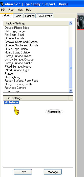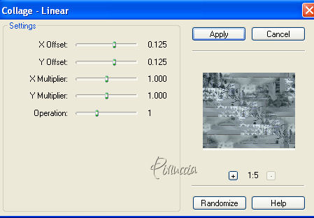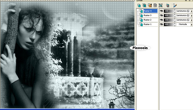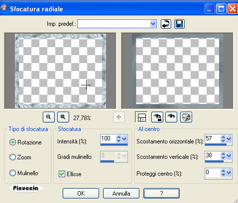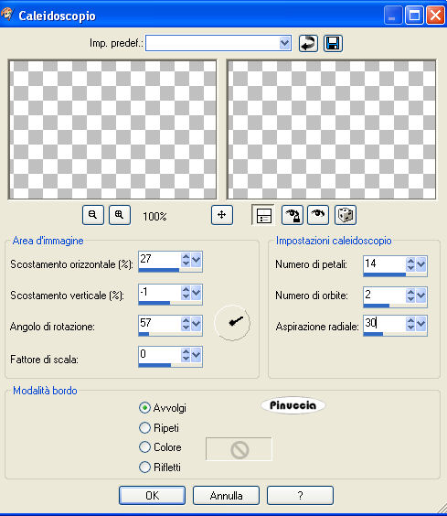 qui puoi trovare qualche risposta ai tuoi dubbi. Se l'argomento che ti interessa non è presente, ti prego di segnalarmelo. Occorrente: Materiale qui Se vuoi condividere i tubes, ti prego di lasciare intatto il livello del copyright. Filtri: Fm Tile Tools Xero Penta.com Flaming Pear EyeCandy 5 Apri le immagini in PSP. Metti il preset still believe in Alien Skin/Eye Candy 5 Impact/cartella Bevel. 1. Imposta il colore di primo piano su #a3b1b2. Apri una nuova immagine trasparente 600 x 480 pixels e riempila con questo colore.2. Effetti>Plugins>Penta.com / Dot and cross, con i settaggi standard: ![]() 3. Apri il tube Stairs e vai a Modifica>Copia. Torna al tuo lavoro e vai a Modifica>Incolla>Incolla come nuovo livello. Posizionalo sull'angolo in alto a destra.Nella paletta dei livelli cambia la modalità di miscelatura in luminanza (esistente). ![]() 4. Apri il tube Kat010 e vai a Modifica>Copia. Torna al tuo lavoro e vai a Modifica>Incolla>Incolla come nuovo livello. Posizionalo al centro (vedi come esempio la tag finale).Nella paletta dei livelli cambia la modalità di miscelatura in Luminanza (esistente). 5.Apri il tube Model007 e vai a Modifica>Copia. Torna al tuo lavoro e vai a Modifica>Incolla>Incolla come nuovo livello. Spostalo a sinistra.Nella paletta dei livelli cambia la modalità di miscelatura in Luminanza (esistente). ![]() 6. Livelli>Unisci>Unisci visibile. 7. Effetti>Plugins>Xero / Porcelain, con i settaggi standard: ![]() 8. Effetti>Plugins>Eye Candy 5 Impact / Bevel, seleziona il preset "Still believe" e clicca ok. ![]() Se non hai Eye Candy, puoi procedere coś: immagine>aggiungi bordatura, 2 pixels, simmetriche, con il colore nero 9. Immagine>Aggiungi bordatura, 30 pixels, simmetriche, con il colore #a3b1b2. 10. Seleziona il bordo con la bacchetta magica ![]() 11. Effetti>Effetti di riflesso>Caleidoscopio: ![]() 12. Mantieni selezionato. 13. Regola>Sfocatura>Sfocatura radiale: ![]() 14. Effetti>Plugins>FM Tile Tools /Collage linear, con i settaggi standard: ![]() Selezione> Nessuna selezione. 15. Effetti>Plugins>Flaming Pear / Aetherize (puoi provare anche altri settaggi, come preferisci). ![]() 16. Effetti>Plugins>Eye Candy 5 Impact /Bevel, applica nuovamente il preset Still believe. 17. Immagine>Ridimensiona, 85% tutti i livelli selezionato. Salva in formato jpg.