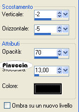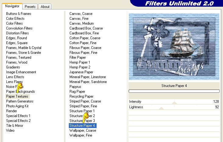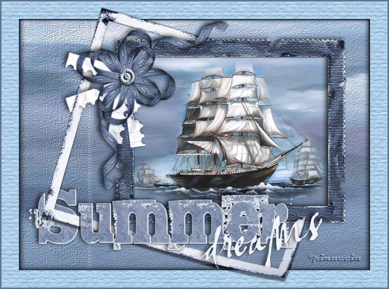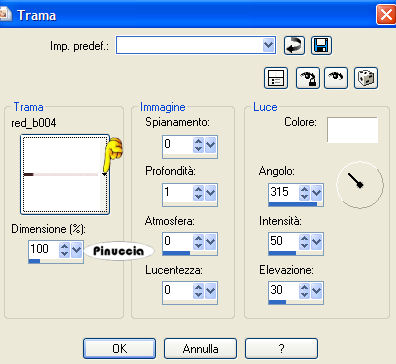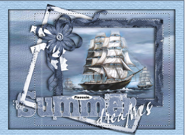 qui puoi trovare qualche risposta ai tuoi dubbi. Se l'argomento che ti interessa non è presente, ti prego di segnalarmelo. Occorrente: Materiale qui Filters Unlimited 2.0 qui Il materiale scrap viene da http://tech.groups.yahoo.com/group/ScrappyExpressions/ Metti la trama nella cartella Trame di PSP, e apri il resto del materiale in PSP. Apri una nuova immagine trasparente 700 x 500 pixels. Scegli un colore chiaro come colore di primo piano e un colore scuro come colore di sfondo. Questi colori serviranno per i bordi. Come usare i colori impostati nella paletta dei materiale per aggiungere i bordi, vedi qui Apri l'immagine fornita con il materiale: "On open sea_Misted by Kathy_Kms", Posizionati sul livello inferiore (lo sfondo) ![]() Modifica>Copia. non chiudere l'immagine: ti servirà ancora Torna alla tua immagine trasparente. Selezione>Seleziona tutto. Modifica>Incolla>Incolla nella selezione. Effetti>Effetti di trama>Trama. Apri il menu cliccando sulla freccia indicata dalla manina, cerca e seleziona la trama fornita con il tutorial: red_B004. ![]() Effetti>Effetti di bordo>Aumenta. Apri il tube della cornice fornito con il materiale: "SE_Frame_3". Modifica>Copia. Torna al tuo lavoro e vai a Modifica>Incolla>Incolla come nuovo livello. Sposta la cornice in alto a destra.![]() Effetti>Effetti 3D>Sfalsa ombra, con i seguenti settaggi, colore nero: ![]() Attiva nuovamente l'immagine "On open sea". Chiudi il livello del watermark. ![]() Attiva uno degli altri livelli e vai a Modifica>Copia unione. Torna al tuo lavoro. Attiva il livello Raster 1 (il livello di sfondo). Modifica>Incolla>Incolla come nuovo livello. Sistema l'immagine nella cornice.![]() Non dovrebbero rimanere tracce dell'immagine al di fuori della cornice. Ma in tal caso seleziona la parte e premi sulla tastiera il tasto canc.Attiva il livello superiore (Raster 2). Apri il testo "SE_SummerDreams_Title" e vai a Modifica>Copia. Torna al tuo lavoro e vai a Modifica>Incolla>Incolla come nuovo livello. Spostalo in basso, come preferisci.Effetti>Effetti 3D>Sfalsa ombra, con i settaggi precedenti. Attiva nuovamente il livello Raster 1 (il livello di sfondo). Apri il tube SE_Seaweed-frame e vai a Modifica>Copia. Torna al tuo lavoro e vai a Modifica>Incolla>Incolla come nuovo livello. E' già correttamente posizionata. Non occorre spostarla. Livelli>Unisci>Unisci tutto. Immagine>Aggiungi bordatura, 3 pixels, simmetriche, con il colore scuro di sfondo. Immagine>Aggiungi bordatura, 35 pixels, simmetriche, con il colore chiaro di primo piano. Seleziona questo bordo con la bacchetta magica ![]() ![]() Effetti>Plugins>Filters Unlimited 2.0 - Paper textures - Structure paper 4, con i settaggi standard ![]() Effetti>Effetti 3D>Sfalsa ombra, con i settaggi precedenti. Ripeti l'Effetto Sfalsa ombra, con i valori positivi: ![]() Selezione>Nessuna selezione. Immagine>Aggiungi bordatura, 3 pixels, simmetriche, con il colore scuro di sfondo. Modifica>Incolla>Incolla come nuovo livello (il tube Seaweed Frame è ancora in memoria). Attiva lo strumento Selezione , rettangolo,e traccia un rettangolo come nel mio esempio. ![]() Premi una volta sulla tastiera il tasto CANC ![]() Selezione>Nessuna selezione. Aggiungi il tuo watermark e salva in formato jpg. ![]() ![]() Se hai problemi o dubbi, o trovi un link non funzionante, o anche soltanto per un saluto, scrivimi. 9 Luglio 2007 |