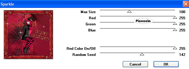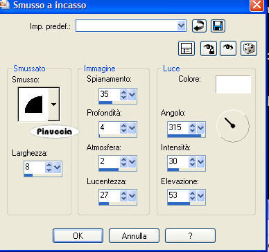 qui puoi trovare qualche risposta ai tuoi dubbi. Se l'argomento che ti interessa non è presente, ti prego di segnalarmelo. Questo tutorial è stato scritto con PSP 9, ma può essere eseguito anche con le altre versioni di PSP. Occorrente: Un tube a scelta. Materiale qui Apri il motivo oro e minimizzalo nella tua area di lavoro. Lo troverai nella lista dei motivi disponibili quando ti servirà. Apri i fonts e minimizzali. Li troverai nella lista dei font disponibili quando ti serviranno. Filtri: Flaming Pear - Solidify qui Funhouse 1 e 2 qui VM Natural qui Simple qui Il tube che ho usato per illustrare il tutorial è di Filly 1. Apri una nuova immagine trasparente 500 x 500 pixels. Apri il tube che hai scelto a vai a Modifica>Copia. Torna all'immagine trasparente e vai a Modifica>Incolla>Incolla come nuovo livello. Livelli>Unisci>Unisci visibile. Livelli>Duplica. 2. Chiudi il livello della copia. Attiva il livello del tube originale. Effetti>Plugins>Flaming Pear - Solidify. Effetti>Funhouse>Xaggerate: ![]() Rendi nuovamente visibile il livello della copia. 3. Immagine>Aggiungi bordatura, 3 pixels, simmetriche, con un colore qualsiasi, purchè non presente nell'immagine. Seleziona il bordo con la bacchetta magica ![]() Imposta il colore di primo piano su Motivi e seleziona il motivo oro Gold1. ![]() Effetti>Plugins>VM Toolbox - Brightness Noise, con i settaggi standard. ![]() Selezione>Nessuna selezione. Immagine>Aggiungi bordatura, 30 pixels, simmetriche, con un colore preso dall'immagine. Seleziona il bordo con la bacchetta magica ![]() Effetti>Plugins>VM Toolbox - Brightness Noise: regola a tua discrezione, se ti sembra troppo scuro, il settaggio della luminanza (Brightness). Effetti>Effetti 3D>Smusso a incasso: ![]() Selezione>Nessuna selezione. Immagine>Aggiungi bordatura, 3 pixels, simmetriche, con un colore qualsiasi. Seleziona il bordo con la bacchetta magica ,e riempilo con il motivo oro.Effetti>Plugins>VM Toolbox - Brightness Noise. Selezione>Nessuna selezione. 4. Livelli>Nuovo livello raster. Imposta il colore di primo piano con il motivo oro e il colore di sfondo con un colore preso dall'immagine. Attiva lo strumento Testo , seleziona il font Fancy Pants, pennellata 1,per la dimensione regolati a seconda della lunghezza del testo. Scrivi il tuo testo e posizionalo. Effetti>Plugins>VM Toolbox - Brightness Noise. Effetti>Effetti 3D>Sfalsa ombra, con i seguenti settaggi, colore nero ![]() Selezione>Nessuna selezione. 6. Seleziona il font Dingbat Corner2. Livelli>Nuovo livello raster. Scegli un angolo e digita la relativa lettera in carattere maiuscolo, con gli stessi settaggi usati per il testo al punto 5. Posiziona l'immagine nell'angolo in alto a sinistra. Effetti>Effetti 3D>Sfalsa ombra, con i seguenti settaggi, colore nero. ![]() Selezione>Nessuna selezione. Effetti>Plugins>Simple - Top left mirror. Questo filtro duplicherà l'angolo e lo posizionerà negli altri tre angoli. Se il risultato non ti soddisfa, annulla con Modifica>Annulla Filtro Simple, e duplica il livello dell'angolo, posizionandolo come preferisci. Questo è il momento, se vuoi, di aggiungere la tua firma o il tuo watermark. Livelli>Unisci>Unisci tutto. Se vuoi, ridimensiona l'immagine a 500 x 500 pixels e, se necessario, metti a fuoco. 7. Le stelle. Seleziona la parte che vuoi animare.Effetti>Plugins>VM Toolbox - Sparkle, e imposta il valore "Max Size" a 100. ![]() Selezione>Nessuna selezione. Modifica>Copia. Apri Animation Shop. Clicca con il tasto destro del mouse sullo spazio vuoto e Incolla come nuova animazione. ![]() Torna in PSP. Modifica>Annulla azione Nessuna selezione. Modifica>Annulla azione Sparkle. Effetti>Plugins>VM Toolbox - Sparkle, e cambia il settaggio "Max Size". Selezione>Nessuna selezione. Modifica>Copia. Torna in Animation Shop e vai a Modifica>Incolla>Incolla dopo il fotogramma corrente. Ancora in PSP. Modifica>Annulla azione Nessuna selezione. Modifica>Annulla azione Sparkle. Ripeti l'Effetto Sparkle, cambiando ancora il settaggio "Max Size". Selezione>Nessuna selezione. Modifica>Copia. Di nuovo in Animation Shop e vai a Modifica>Incolla>Incolla dopo il fotogramma corrente. Clicca sul primo fotogramma per selezionarlo e vai a Modifica>Seleziona tutto. Animazione>Proprietà fotogramma, e imposta la velocità a 45. ![]() Per controllare il risultato, clicca su Visualizza .Salva in formato gif. ![]() Se hai problemi o dubbi, o trovi un link non funzionante, o anche soltanto per un saluto, scrivimi 19 Giugno 2007 |