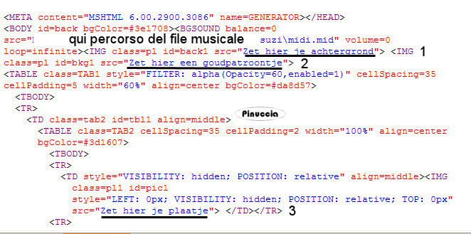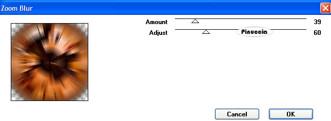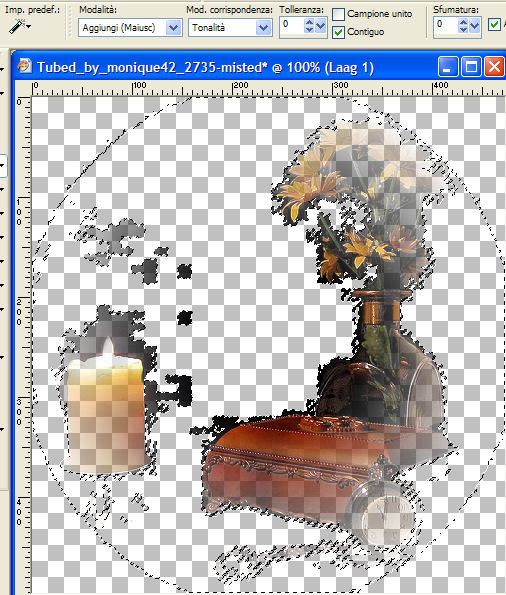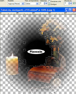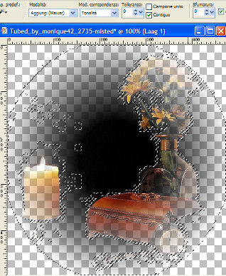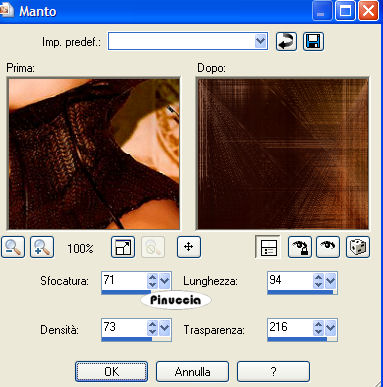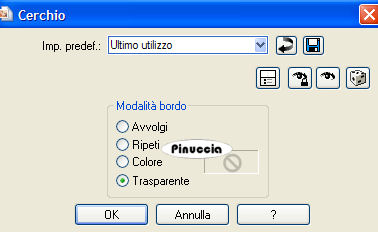 qui puoi trovare qualche risposta ai tuoi dubbi. Se l'argomento che ti interessa non è presente, ti prego di segnalarmelo. Occorrente: Materiale qui I tubes usati per questo tutorial sono di Suzi Sgai e Monique42. Filtro VM Toolbox qui Imposta il colore di primo piano con #290800, e il colore di sfondo con #F7A56B. Passa il colore di primo piano a Gradiente di primo piano/sfondo, con i seguenti settaggi: ![]() 1. Apri il tube di Suzi SS1901, duplicalo con shift+D e metti da parte l'originale, perchè ti servirà ancora. Continua sulla copia. 2. Elimina il livello del watermark. Livelli>Nuovo livello raster. Riempi con il gradiente.Livelli>Disponi>Sposta giù. 3. Livelli>Unisci>Unisci visibile. 4. Effetti>Effetti di trama>Manto, con i seguenti settaggi: ![]() 5. Attiva nuovamente il tube di Suzi e vai a Modifica>Copia. Torna al tuo lavoro e vai a Modifica>Incolla>Incolla come nuovo livello. Livelli>Unisci>Unisci tutto. 6. Immagine>Ridimensiona, a 300 pixels di larghezza, tutti i livelli selezionato. 7. Selezione>Seleziona tutto. Selezione>Modifica>Contrai, di 25 pixels. 8. Effetti>Effetti 3D>Sfalsa ombra, con i seguenti settaggi: ![]() Ripeti l'Effetto Sfalsa ombra, ma cambiando verticale e orizzontale a -2, 9. Immagine>Rifletti. Regola>Messa a fuoco>Metti a fuoco. 10. Immagine>Aggiungi bordatura, 1 pixel, simmetriche con il colore di primo piano. Avrai questo: ![]() Metti da parte l'immagine per il momento. 11. Ritorna al tube originale. Elimina il livello del watermark. Livelli>Nuovo livello raster. Riempi con il gradiente.Livelli>Disponi>Sposta giù. 12. Livelli>Unisci>Unisci visibile. 13. Immagine>Ruota per gradi>Ruota di 90 gradi in senso antiorario. Se stai usando PSP X: Immagine>Ruota a sinistra. 14. Immagine>Ridimensiona, di 650 x 480 gradi, mantieni proporzioni non selezionato. ![]() Avrai questo: ![]() Effetti>Effetti di trama>Manto, con i settaggi precedenti. 15. Attiva l'immagine che hai messo da parte al punto 10 e vai a Modifica>Copia. Torna al tuo lavoro e vai a Modifica>Incolla>Incolla come nuovo livello. Sposta l'immagine a sinistra.![]() 16. Effetti>Effetti 3D>Sfalsa ombra, con i seguenti settaggi: ![]() Ripeti l'Effetto Sfalsa ombra, ma cambiando verticale e orizzontale a -2. 17. Attiva nuovamente la piccola immagine del punto 10. Innalza livello di sfondo. 18. Effetti>Effetti geometrici>Cerchio: ![]() 19. Clicca con la bacchetta magica sulla parte trasparente.Selezione>Inverti. 20. Modifica>Copia. Modifica>Incolla>Incolla come nuova IMMAGINE. 21. Effetti>Plugins>VM Toolbox - Zoom Blur, con i seguenti settaggi: ![]() 22. Effetti>Effetti geometrici>Cerchio, con i settaggi precedenti. 23. Immagine>Ridimensiona, a 150x150 pixels. Regola>Messa a fuoco>Metti a fuoco. Metti da parte questa immagine. ![]() 24. Apri il tube di Monique. Elimina i livelli del watermark e dello sfondo. 25. Immagine>Rifletti. 26. Modifica>Copia. Torna al tuo lavoro (l'immagine più grande) e vai a Modifica>Incolla>Incolla come nuovo livello. Posiziona il tube al centro, vedi l'esempio sotto.![]() 27. Ritorna al tube di Monique. Attiva lo strumento Bacchetta magica e seleziona il cerchio nero.il risultato non cambia di molto se usi la modalità di corrispondenza colore o tonalità. ![]() ![]() Premi sulla tastiera il tasto CANC .Selezione>Nessuna selezione. 28. Attiva lo strumento Gomma ![]() e cancella la candela a sinistra. Intorno ai fiori e al cofanetto rimarranno i residui dello sfondo. Con cura, cerca di eliminare queste macchie nere. ![]() 29. Quando sei soddisfatto vai a Modifica>Copia. Torna al tuo lavoro e vai a Modifica>Incolla>Incolla come nuovo livello. Posiziona il tube esattamente sopra il precedente.![]() 30. Regola>Messa a fuoco>Metti a fuoco. 31. Attiva la piccola immagine rotonda che hai messo da parte al punto 23 e vai a Modifica>Copia. Torna al tuo lavoro e vai a Modifica>Incolla>Incolla come nuovo livello. Sposta l'immagine a destra.32. Effetti>Effetti 3D>Sfalsa ombra, con i seguenti settaggi: ![]() 33. Livelli>Duplica, 2 volte. Sistema i tre cerchi come nel mio esempio.34. Abbassa l'opacità del livello superiore al 20%, quella del livello di centro al 50%, e il livello inferiore all'85%. 35. Livelli>Unisci>Unisci tutto. 36. Immagine>Aggiungi bordatura, 1 pixel, simmetriche, con il colore di primo piano. per aggiungere velocemente i bordi con i colori impostati nella paletta dei materiali, vedi qui Immagine>Aggiungi bordatura, 10 pixels, simmetriche, con il colore di sfondo. Seleziona il bordo con la bacchetta magica ![]() 37. Effetti>Effetti di trama>Manto, con i settaggi precedenti. ![]() Selezione>Nessuna selezione. 38. Immagine>Aggiungi bordatura, 1 pixel, simmetriche, con il colore di primo piano. L'immagine è finita. Se vuoi realizzare lo script di Jeannette, ti servono anche 2 immagini di sfondo. Indicazioni per gli sfondi: Questo è quello che ho fatto io. Naturalmente, puoi scegliere di creare altri sfondi, o cambiare le impostazioni come preferisci. Per il primo sfondo apri un'immagine trasparente 150x150 e riempila con il gradiente. Effetti>Effetti di trama>Manto, con i settaggi usati nel corso del tutorial. Effetti>Effetti di immagine>Motivo unico, con i settaggi standard. Livelli>Unisci>Unisci tutto e salva in formato jpg come sfondo1. Per il secondo sfondo apri un'immagine trasparente 150x150 e riempila con un motivo oro. Salva in formato jpg. Per eseguire lo script Apri lo script di Jeannette che trovi qui, e segui i preliminari descritti alla fine di questo tutorial, fino all'inserimento dello sfondo-suono. Dopo aver inserito lo sfondo-suono, dovrai indicare allo script dove trovare le immagini. Clicca su Origine e identifica i punti di inserimento dei vari elementi dello script. Se hai messo tutti i file in una cartella, il percorso del suono ti servirà da guida per l'inserimento degli altri files: ti basterà cambiare l'ultima parte: il nome e l'estensione. Nella schermata sotto sono indicati i punti in cui dovrai inserire, tra le virgolette, il percorso d