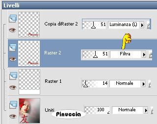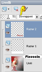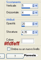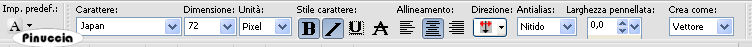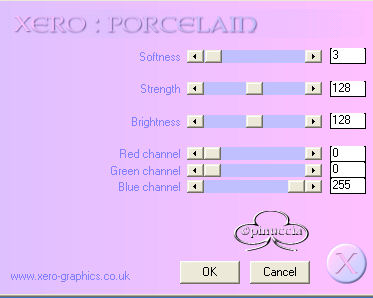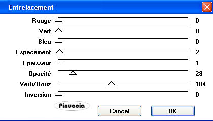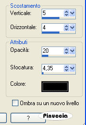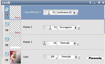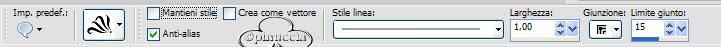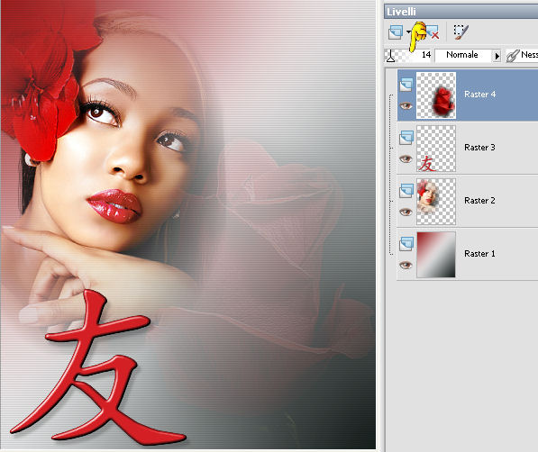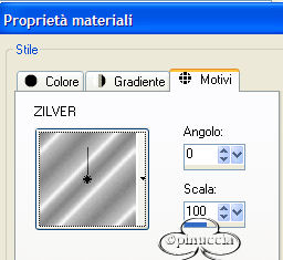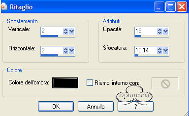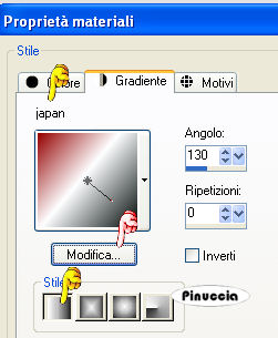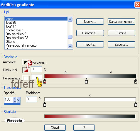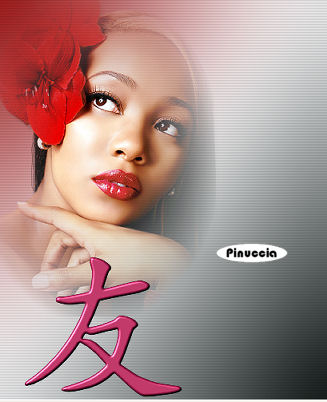 qui puoi trovare qualche risposta ai tuoi dubbi. Se l'argomento che ti interessa non è presente, ti prego di segnalarmelo. Questo tutorial è stato realizzato con PSP X. Occorrente: Materiale qui I tubes utilizzati sono di Patry e di Filly Filtri: Jeux de lignes qui Xero qui 1. Apri i tubes, duplicali (shift+D) e chiudi gli originali. Imposta come colore di primo piano #010a08 e come colore di sfondo #950101. 2. Apri una nuova immagine trasparente 416 x 500 pixels. 3. Crea un gradiente lineare con 3 colori: seleziona il gradiente "Japan" con i seguenti settaggi: ![]() clicca su Modifica (manina rossa) ![]() ![]() clicca Personalizza e imposta il colore #fdfeff; clicca Diminuisci (manina rossa) e quindi Chiudi. Rispondi sì alla domanda se vuoi salvare il gradiente. 4. Riempi l'immagine con questo gradiente.5. Regola>Sfocatura>sfocatura gaussiana, raggio 50. ![]() 6. Effetti>Plugins>Jeux de lignes / Entrelacement: ![]() 7. Apri il tube del ritratto orientale e vai a Modifica>Copia. 8. Livelli>Carica/Salva maschera>Carica maschera da disco. Cerca e carica la maschera 20-20 (inverti trasparenza non selezionato). ![]() Livelli>Unisci>Unisci gruppo. 9. Modifica>Copia. Torna al tuo lavoro e vai a Modifica>Incolla come nuovo livello. 10. Immagine>Ridimensiona, 80%, (tutti i livelli non selezionato). 11. Sposta l'immagine in alto a sinistra.![]() 12. Effetti>Effetti 3D>Sfalsa ombra, con i seguenti settaggi: ![]() 13. Apri il tube del segno orientale e vai a Modifica>copia. Torna al tuo lavoro e vai a Modifica>Incolla come nuovo livello. 14. Immagine>Ridimensiona, 40% (secondo il tube scelto), tutti i livelli non selezionato. Dovresti avere questo: ![]() 15. Regola>Saturazione e Tonalità>Viraggio: ![]() 16. Effetti>Effetti 3D>Sfalsa ombra, con gli stessi settaggi del passo 12. 17. Apri il tube del fiore e vai a Modifica>Copia. Torna al tuo lavoro e vai a Modifica>Incolla come nuovo livello. 18. Nella paletta dei livelli abbassa l'opacità di questo livello al 14%. ![]() Livelli>Unisci>Unisci visibile. 19. Attiva lo strumento Selezione , rettangoloSelezione personalizzata ![]() con i seguenti settaggi: ![]() Livelli>Nuovo livello raster. 20. Imposta il colore di primo piano con #fdfeff e riempi la selezione con questo colore.21. Nella paletta dei livelli, abbassa l'opacità di questo livello al 14%. ![]() Selezione>Deseleziona. 22. Effetti>Effetti 3D>Sfalsa ombra: ![]() 23. Imposta il colore rosso (#950101) come colore di sfondo. Chiudi il colore di primo piano. Attiva lo strumento Testo con i seguenti settaggi:![]() 24. Firma la tag sulla destra del rettangolo, poi nella paletta dei livelli clicca con il tasto destro del mouse e scegli Converti in livello raster. 25. Effetti>Effetti 3D>Sfalsa ombra, con i seguenti settaggi, colore dell'ombra #fdfeff: ![]() 26. Nella paletta dei livelli, abbassa l'opacità del livello al 51% e cambia la modalità di miscelatura in Sovrapponi. ![]() 27. Livelli>Duplica. Nella paletta dei livelli, cambia la modalità di miscelatura di questa copia in Luminanza (Esistente). ![]() 28. Posizionati sul livello Raster 2. Cambia la modalità di miscelatura del livello in Filtra. ![]() 29. Rimani posizionato su questo livello (modalità Filtra). Effetti>Effetti di distorsione>Vento: ![]() 30. Con lo strumento Puntatore appiattisci e tira leggermente il testo (usando i nodi della griglia).Fai la stessa copia con il livello della copia (modalità Luminanza L). Gioca con gli strumenti puntatore e spostamento per ottenere il miglior risultato e posizionarlo correttamente.![]() Livelli>unisci>Unisci visibile. Livelli>nuovo livello raster. 31. Imposta il colore di sfondo con il Motivo argento (Zilver). Sarà sufficiente aprire il file in PSP e lo avrai disponibile nella paletta dei materiali. ![]() Imposta il colore scuro come colore di primo piano. Attiva lo strumento Forme predefinite .Cerca la forma "cdsign46", che si trova nel file contenuto nello zip: Forme/cdsign_ornamente_03. ![]() 32, Traccia la forma in alto a destra della tag (vedi tag finale). 33. Effetti>Effetti 3D>Sfalsa ombra: ![]() 34. Nella paletta dei livelli, cambia la modalità di miscelatura di questo livello in Luce netta. Livelli>Unisci>Unisci tutto (appiattisci). 35. Immagine>Aggiungi bordatura, 3 pixels, simmetriche, con il colore bianco. Seleziona il bordo con la bacchetta magica ![]() Riempi il bordo con il Motivo argento:(poichè il motivo argento si trova impostato come colore di sfondo clicca con il tasto destro del mouse). Selezione>Deseleziona. 36. Selezione>Seleziona tutto. Selezione>Modifica>contrai, di 3 pixels. 37. Effetti>Effetti 3D>Ritaglio: ![]() Selezione>Deseleziona. 38. Effetti>Plugins>Xero / Porcelain: ![]() 39. Effetti>Plugins>Xero / Illustrator: ![]() 40. Regola>Correzione fotografica intelligente Il Blend è finito. Salva in formato jpg. ![]() Se hai problemi o dubbi, o trovi un link non funzionante, o anche soltanto per un saluto, scrivimi. Settembre 2006 |
