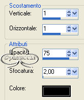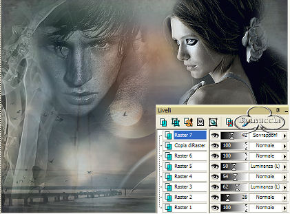 qui puoi trovare qualche risposta ai tuoi dubbi. Se l'argomento che ti interessa non è presente, ti prego di segnalarmelo. Questo tutorial è stato scritto in PSP 9, ma può essere eseguiti anche con le altre versioni del programma. Occorrente: Materiale qui I tubes che ho usato sono di Marif, Caro e Giada. Per favore, rispetta il lavoro degli autori e mantieni i tubes al loro stato originale. Filtri: FM Tile Tools qui Xero qui Penta.com qui 1. Apri una nuova immagine trasparente 640 x 480 pixels. Imposta il colore di primo piano con #8e999f, e il colore di sfondo con #2f3f4a. Passa il colore di primo piano a Gradiente di primo piano/sfondo, con i seguenti settaggi: ![]() Riempi l'immagine trasparente con questo gradiente.2. Livelli>Nuovo livello raster. Selezione>Seleziona tutto. 3. Apri il file "Achtergrond" e vai a Modifica>Copia. Torna al tuo lavoro e vai a Modifica>Incolla>Incolla nella selezione. Selezione>Nessuna selezione. Abbassa l'opacità di questo livello al 28%. 4. Apri il tube "Marif_2006_octobre_misted_fantasy099" e vai a Modifica>Copia. Torna al tuo lavoro e vai a Modifica>Incolla>Incolla come nuovo livello. Spostalo a sinistra.Nella paletta dei livelli cambia la modalità di miscelatura in luminanza (esistente) e abbassa l'opacità al 62%. 5. Apri il tube "Marif_2006_septembre_misted_paysage11" e vai a Modifica>Copia. Torna al tuo lavoro e vai a Modifica>Incolla>Incolla come nuovo livello. Con lo strumento Deformazione "tira" il tubein alto e in basso in modo che raggiunga entrambi i bordi. ![]() Nella paletta dei livelli abbassa l'opacità di questo livello al 54%. 6. Apri il tube "Caro3072". Immagine>Ridimensiona, al 60%, ricampionamento bicubica: ![]() Modifica>Copia. Torna al tuo lavoro e vai a Modifica>Incolla>Incolla come nuovo livello. Spostalo in alto a sinistra, vedi la schermata sotto.![]() Nella paletta dei livelli cambia la modalità di miscelatura di questo livello in Luminanza (esistente) e abbassa l'opacità al 50%. ![]() 7. Nella paletta dei livelli posizionati sul livello raster 3. Attiva lo strumento Gomma ![]() e cancella dal viso dell'uomo i segni del tube. ![]() Attiva il livello superiore. Effetti>Plugins>FM Tile Tools - Blend Emboss, con i settaggi standard. ![]() 8. Apri il tube "Giada_i_m_waiting_for_it_to_happen". Immagine>Ridimensiona, al 90%, bicubica. Modifica>Copia. Torna al tuo lavoro e vai a Modifica>Incolla>Incolla come nuovo livello. Spostalo a destra.Nella paletta dei livelli posizionati sul livello Raster 4. Attiva nuovamente lo strumento Gomma ![]() e cancella dal braccio della donna i segni del tube sottostante: ![]() Attiva il livello superiore. Effetti>Plugins>FM Tile Tools - Blend Emboss, con i settaggi standard. Livelli>Duplica. 9. Apri il tube "Marif_2006_octobre_misted_paysage026" e vai a Modifica>Copia. Torna al tuo lavoro e vai a Modifica>Incolla>Incolla come nuovo livello. Spostalo in basso a sinistra.Nella paletta dei livelli cambia la modalità di miscelatura in Sovrapponi e abbassa l'opacità al 42%. ![]() 10. Livelli>Unisci>Unisci tutto. Effetti>Plugins>Xero - Porcelain, con i settaggi standard. ![]() 11. Modifica>Copia (per sicurezza, fai anche una copia dell'immagine con Shift+D e mettila da parte). 12. Immagine>Aggiungi bordatura, 1 pixel, simmetriche, con il colore #191b25. Immagine>Aggiungi bordatura, 5 pixels, simmetriche, con il colore #8e999f. Seleziona il bordo con la bacchetta magica ![]() Effetti>Plugins>Penta.com - Colordot, con i settaggi standard. ![]() Effetti>Effetti 3D>Sfalsa ombra: ![]() Ripeti l'Effetto Sfalsa ombra, cambiando verticale e orizzontale a -3. Immagine>Aggiungi bordatura, 1 pixel, simmetriche, con il colore #191b25. 13. Immagine>Aggiungi bordatura, 35 pixels, simmetriche, con il colore bianco (#ffffff). Seleziona il bordo con la bacchetta magica , sfumatura 0.Modifica>Incolla>Incolla nella selezione, e incolli l'immagine che hai copiato al passo 11. Se per qualche ragione non hai più in memoria l'immagine, attiva la copia e vai a Modifica>Copia. Regola>Sfocatura>Sfocatura gaussiana, raggio 30. ![]() 14. Effetti>Plugins>Xero - Fritillary, con i settaggi standard. ![]() Livelli>Nuovo livello raster. Riempi con il colore #8e999f.Ricorda che hai ancora il colore di primo piano impostato a Gradiente. Prima di riempire dovrai riportarlo al colore. Abbassa l'opacità di questo livello al 46%. Effetti>Effetti 3D>Sfalsa ombra: ![]() 15. Livelli>Unisci>Unisci tutto. Immagine>Aggiungi bordatura, 1 pixel, simmetriche, con il colore #191b25. Immagine>Aggiungi bordatura, 7 pixels, simmetriche, con il colore #8e999f. Seleziona il bordo con la bacchetta magica , sfumatura 0.Effetti>Plugins>Penta.com - Color dot, con i settaggi standard. Effetti>Effetti 3D>Sfalsa ombra: ![]() Ripeti l'Effetto Sfalsa ombra, cambiando verticale e orizzontale a -3. Immagine>Aggiungi bordatura, 1 pixel, simmetriche, con il colore #191b25. Selezione>Nessuna selezione. 16. Adesso aggiungi il testo. Attiva lo strumento Testo ![]() Chiudi il colore di primo piano e imposta il colore di sfondo con #b8c1c4. Io ho usato il font Cynthia Script ES, con i seguenti settaggi: ![]() Scrivi il testo e posizionalo. Livelli>Converti in livello raster. Effetti>Effetti 3D>Sfalsa ombra: ![]() Aggiungi il tuo nome o il tuo watermark. Se vuoi, ridimensiona l'immagine, usando il tipo di ricampionamento "Dimensione ottimale". Livelli>Unisci>Unisci tutto. Salva in formato jpg. ![]() ![]() Se hai problemi o dubbi, o trovi un link non funzionante, o anche soltanto per un saluto, scrivimi. Gennaio 2007 |
