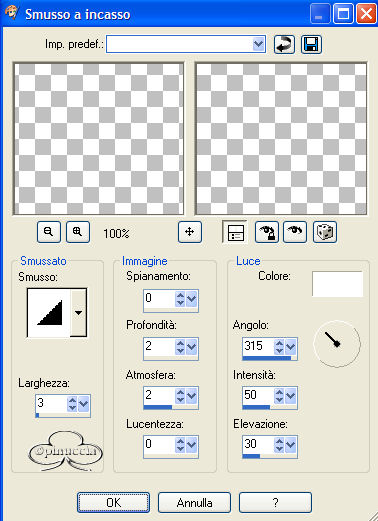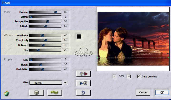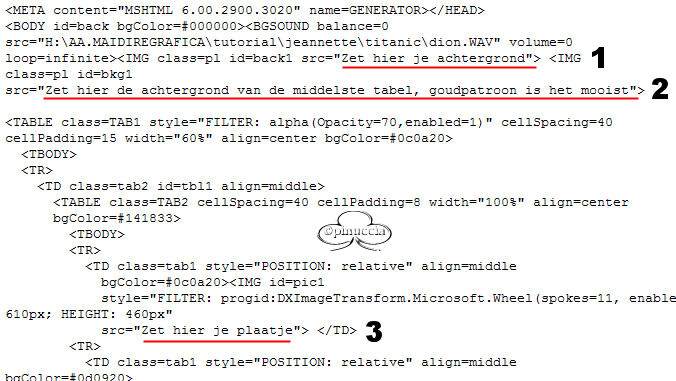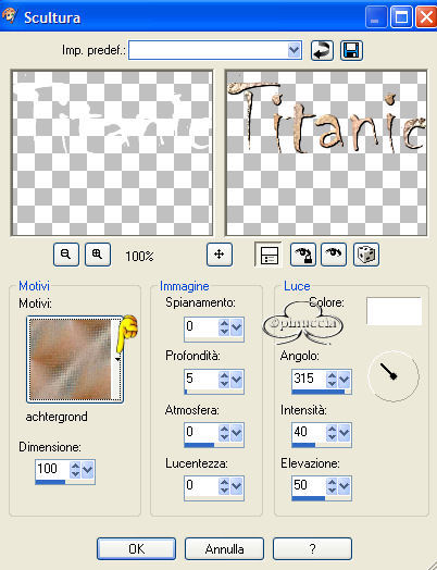 qui puoi trovare qualche risposta ai tuoi dubbi. Se l'argomento che ti interessa non è presente, ti prego di segnalarmelo. Materiale qui Il tube è di JBL, il resto del materiale è di Jeannette. Metti il Motivo nella cartella dei Motivi di PSP. Filtro Flaming Pear - Flood qui 1. Apri la foto del Titanic. 2. Apri il tube JBL073106. Immagine>Rifletti. Modifica>Copia. Torna alla foto del Titanic e vai a Modifica>Incolla>Incolla come nuovo livello. 3. Sposta il tube nell'angolo in basso a sinistra:![]() 4. Livelli>Unisci>Unisci tutto. 5. Effetti>Plugins>Flaming Pear - Flood: ![]() 6. Apri l'altro tube con la coppia - Titanic_Jean - e vai a Modifica>Copia. Torna al tuo lavoro e vai a Modifica>Incolla>Incolla come nuovo livello. Spostalo nell'angolo in alto a destra.7. Nella paletta dei livelli abbassa l'opacità al 50%. 8. Livelli>Unisci>Unisci visibile. 9. Attiva lo strumento Testo ,chiudi il colore di primo piano e imposta il colore di sfondo con il bianco (#ffffff). Io ho usato Chiller, dimensione 72. Scrivi Titanic. 10. Effetti>Effetti di trama>Scultura, apri il menu cliccando sulla freccia a fianco del box, e cerca il Motivo che hai trovato nello zip. ![]() 11. Effetti>Effetti 3D>Sfalsa ombra: ![]() Regola>Messa a fuoco>Metti a fuoco, 2 o tre volte. 12. Cambia la dimensione del font a 36, e scrivi Last trip (o, in italiano, Ultimo viaggio). 13. Ripeti i punti 10 e 11. 14. Immagine>Aggiungi bordatura, 5 pixels, simmetriche, con il colore bianco. Seleziona il bordo con la bacchetta magica ![]() Apri il Motivo che hai trovato nello zip e che hai già usato per l'effetto Scultura e minimizzalo. Passa il colore di primo piano a Motivi. Clicca sulla freccia a fianco del box per aprire il menu e troverai il file nella lista dei Motivi disponibili: ![]() Riempi il bordo con questo Motivo.15. Effetti>Effetti 3D>Smusso a incasso: ![]() 16. Regola>Messa a fuoco>Metti a fuoco, 2 volte. Selezione>Nessuna selezione. La tag è finita. Se vuoi usare lo script di Jeannette, hai bisogno anche di due immagini di sfondo: una motivo oro e uno sfondo a tua scelta. Apri lo script di Jeannette che trovi qui (ho tolto il link, perchè il sito è chiuso, ma mantengo le istruzioni che possono servire per casi simili) e segui i preliminari descritti alla fine di questo tutorial, fino all'inserimento dello sfondo-suono. Dopo aver inserito lo sfondo-suono, dovrai indicare allo script dove trovare le immagini. Clicca su Origine e identifica i punti di inserimenti dei vari elementi dello script. Nella schermata sotto, sono indicati i punti di inserimento dei files dello script. Devi cancellare la scritta tra le virgolette e inserire il tuo percorso: Se hai messo tutti i file in una cartella, il percorso del suono ti servirà da guida per l'inserimento degli altri files: ti basterà cambiare l'ultima parte: il nome e l'estensione. 1. Qui inserisci il percorso dello sfondo. 2. Qui il percorso del secondo sfondo, per le bande laterali, meglio se un motivo oro. 3. Qui il percorso dell'immagine principale. ![]() Ricorda che, contemporaneamente, puoi controllare il risultato andando su Anteprima. fai molta attenzione alle estensioni dei files e alle maiuscole-minuscole, che devono essere corrette, altrimenti lo script non troverà le immagini da inserire Cliccando su Anteprima, potrai vedere il risultato del tuo script. Clicca adesso sulla linguetta Modifica, per aggiungere il testo. clicca due volte all'interno del riquadro. Apparirà la cornice che ti dà il via libera per sostituire il testo esistente e aggiungere il tuo. Quando hai finito, clicca all'esterno e la cornice sparirà. Il tuo messaggio con lo script è pronto per il tasto Invia. Se non vuoi spedirlo e vuoi soltanto tenerlo per te, vai a File>Salva con nome e mettilo in una cartella a tua scelta. Ricordati, però, che quando vorrai rivedere lo script, i files devono trovarsi nello stesso posto. Se nel frattempo li avrai spostati, vedrai soltanto delle crocette rosse. Avvertimento: non devi preoccuparti se in Modifica non vedrai il messaggio come dovrebbe essere (per fare questo devi andare in Anteprima). Ricorda ancora che per inviare il messaggio ti devi posizionare su Modifica. ![]() Se hai problemi o dubbi, o trovi un link non funzionante, o anche soltanto per un saluto, scrivimi. 24 Gennaio 2007 |