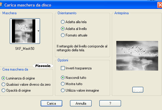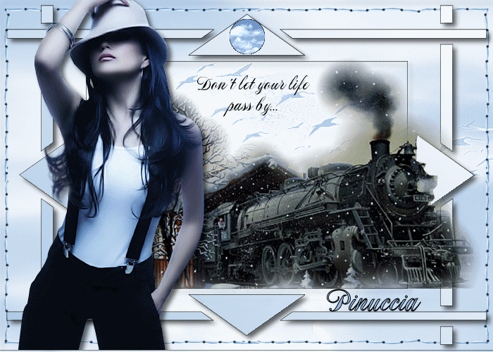 qui puoi trovare qualche risposta ai tuoi dubbi. Se l'argomento che ti interessa non è presente, ti prego di segnalarmelo. Questo tutorial è stato creato in PSP 9. Occorrente: Materiale qui Metti la maschera nella cartella maschere, le forme predefinite nella cartella forme predefinite. Apri i tubes in PSP. L'animazione ti servirà più tardi in Animation Shop. Apri tutte le immagini in PSP. Apri il font e minimizzalo nella tua area di lavoro. qui puoi trovare qualche risposta ai tuoi dubbi. Se l'argomento che ti interessa non è presente, ti prego di segnalarmelo. Imposta il colore di primo piano con un blue chiaro scelto dal tube. Imposta il colore di sfondo con il bianco. Apri una nuova immagine trasparente 700 x 500 pixels e riempila con il blu chiaro.Livelli>Nuovo livello raster. Riempi il nuovo livello con il bianco.Livelli>Carica/salva maschera>Carica maschera da disco. Cerca e carica la maschera SKF-mask 50. ![]() Livelli>Unisci>Unisci gruppo. Apri Snakestitch2 e vai a Modifica>Copia. Torna al tuo lavoro e vai a Modifica>Incolla>Incolla come nuovo livello. Livelli>Unisci>Unisci visibile. Attiva lo strumento Forme predefinite ![]() e cerca la forma "s". ![]() Con il nero impostato come colore di primo piano e chiuso il colore di sfondo, disegna la forma dall'alto a sinistra fino in basso a destra. Livelli>Converti in livello raster Attiva la bacchetta magica ![]() e seleziona le parti della forma: ![]() Riporta il colore di primo piano con il colore chiaro che hai scelto all'inizio (il bianco sempre colore di sfondo) e crea un gradiente di sfondo, lineare, con i seguenti settaggi: ![]() e riempi la selezione con questo gradiente.(ricorda: essendo come gradiente di sfondo, devi cliccare con il tasto destro del mouse). Selezione>Nessuna selezione. Effetti>Effetti 3D>Sfalsa ombra, con i seguenti settaggi, colore nero: ![]() Avrai questo: ![]() Apri l'immagine del treno "Rust-WinterTrain" e vai a Modifica>Copia. Torna al tuo lavoro e vai a Modifica>Incolla>Incolla come nuovo livello. Spostalo un po' a destra in basso.Attiva lo strumento Gomma ![]() e cancella tutto quello che si vede nella parte sotto esterna al bordo. ![]() Apri il tube della donna "Terry Shaded Eyes" e vai a Modifica>copia. Torna al tuo lavoro e vai a Modifica>Incolla>Incolla come nuovo livello. Spostalo a sinistra.Effetti>Effetti 3D>Sfalsa ombra, con i settaggi precedenti. Apri il file di testo e vai a Modifica>Copia. Torna al tuo lavoro e vai a Modifica>Incolla>Incolla come nuovo livello e posizionalo. Se vuoi, puoi anche scrivere un testo a tua scelta. Aggiungi il tuo nome o il tuo watermark. Io ho usato il font NotNorvalHmk, dimensione 36. Se non ce l'hai, eccolo qui Livelli>Unisci>Unisci tutto. Copia l'immagine (Modifica>Copia). Apri Animation Shop e vai a Modifica>Incolla>Incolla come nuova animazione. Modifica>Duplica, e ripeti finchè non avrai un'animazione composta da 27 fotogrammi. Posizionati sul primo fotogramma per selezionarlo e vai a Modifica>Seleziona tutto. Attiva l'animazione delle nuvole contenuta nello zip (000clouds03b). Posizionati sul primo fotogramma per selezionarlo e vai a Modifica>Seleziona tutto. Modifica>Copia. Ritorna al tuo lavoro. Posizionati sul primo fotogramma per selezionarlo e vai a Modifica>Seleziona tutto. Modifica>Incolla>Incolla nel fotogramma selezionato. Posiziona le nuvole al centro del triangolo in alto e quando sei sicuro di aver trovato la posizione corretta, rilascia il tasto del mouse. Ricorda che, quando non sei soddisfatto, puoi tornare indietro con Modifica>Annulla... e ripetere l'operazione. Per controllare il risultato clicca su Visualizza