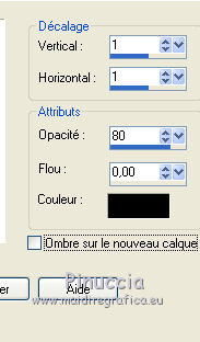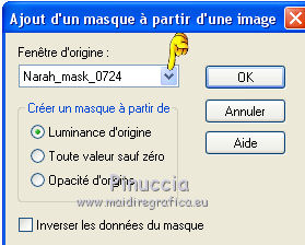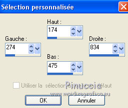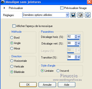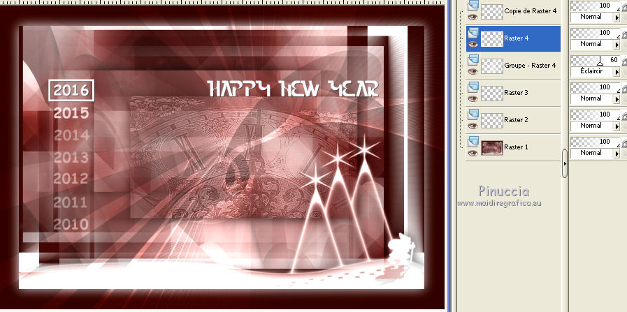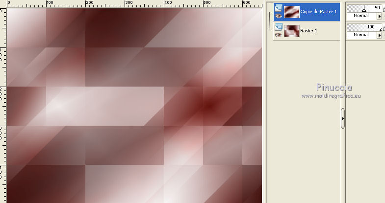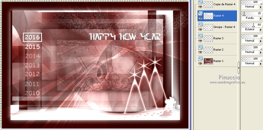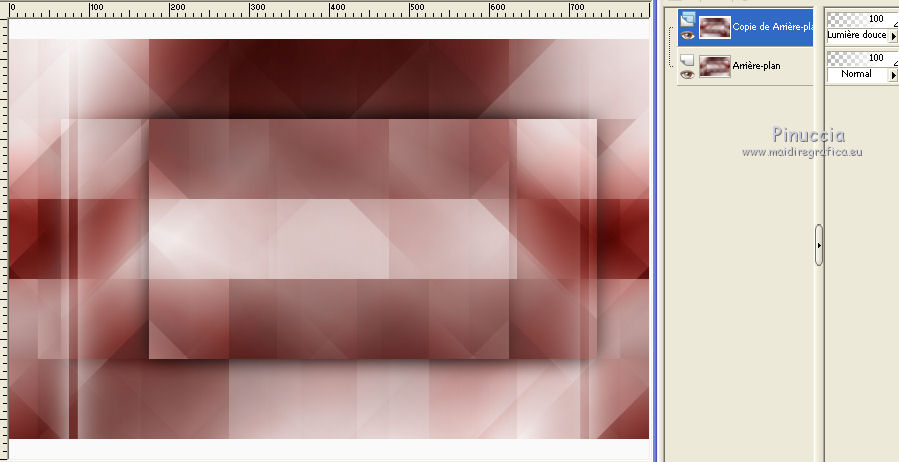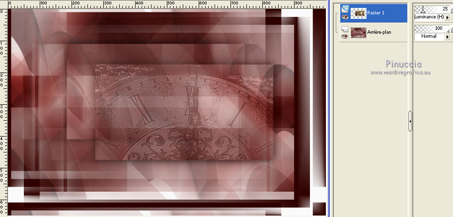Ce tutoriel a été créé avec CorelX6 et traduit avec CorelX12, mais il peut également être exécuté avec les autres versions. Suivant la version utilisée, vous pouvez obtenir des résultats différents. Depuis la version X4, la fonction Image>Miroir a été remplacée par Image>Renverser horizontalement, et Image>Renverser avec Image>Renverser verticalement. Dans les versions X5 et X6, les fonctions ont été améliorées par la mise à disposition du menu Objets. Avec la nouvelle version X7, nous avons encore Image>Miroir et Image>Renverser/Retourner, mais avec nouvelles différences. Voir les détails à ce sujet ici Certaines dénominations ont changées entre les versions de PSP. Les plus frequentes dénominations utilisées: ![]() Traduction en italien ici Vos versions ici ![]() Nécessaire pour réaliser ce tutoriel: Matériel ici Merci pour le tube Gabry et pour les masques Narah Modules Externes: consulter, si nécessaire, ma section des filtres ici AAA Frames - Foto Frame ici Alien Skin Eye Candy 5 Impact - Backlight ici Mehdi - Sorting Tiles ici ![]() en fonction des couleurs utilisées, vous pouvez changer le mode mélange et l'opacité des calques. Dans les plus récentes versions de PSP, vous ne trouvez pas le dégradé d'avant plan/arrière plan ou Corel_06_029. Vous pouvez utiliser le dégradé des versions antérieures. Ici le dossier Dégradés de CorelX. Placer le preset En cliquant sur le preset une ou deux fois (selon vos réglages) automatiquement il se placera directement dans le dossier Settings de Alien Skin Eye Candy. pourquoi un ou deux clic voir ici Ouvrir les masque dans PSP et les minimiser avec le reste du matériel (une image sera utilisée comme masque). 1. Ouvrir une nouvelle image transparente 650 x 500 pixels. 2. Placer en avant plan la couleur claire #f9f9f9, et en arrière plan la couleur foncée #300300. ![]() Préparer en avant plan un dégradé de premier plan/arrière plan, style Linéaire. ![]() Remplir l'image transparente du dégradé.3. Calques>Dupliquer. Image>Miroir. Placer le calque en mode Recouvrement. Calques>Fusionner>Fusionner le calque de dessous. 4. Calques>Dupliquer. Effets>Modules Externes - Mehdi - Sorting Tiles. ![]() 5. Réduire l'opacité de ce calque à 50%. Calques>Fusionner>Fusionner le calque de dessous. 6. Calques>Dupliquer. Effets>Effets géométriques>Inclinaison. ![]() 7. Image>Renverser. Réduire l'opacité de ce calque à 50%. ![]() Calques>Fusionner>Fusionner le calque de dessous. 8. Activer l'outil Sélection ![]() (peu importe le type de sélection, parce que avec la sélection personnalisée vous obtenez toujours un rectangle), cliquer sur Sélection personnalisée ![]() et setter ces paramètres. ![]() Sélections>Transformer la sélection en calque. 9. Effets>Effets 3D>Ombre portée, couleur noire. ![]() Sélections>Désélectionner tout. 10. Image>Renverser. Image>Ajouter des bordures, symétrique décoché, couleur d'avant plan. ![]() 11. Effets>Effets d'image>Mosaïque sans jointures. ![]() 12. Calques>Dupliquer. Image>Miroir. Placer le calque en mode Lumière douce. ![]() Calques>Fusionner>Fusionner le calque de dessous. 13. Calques>Dupliquer. Effets>Effets de distorsion>Coordonnées polaires. ![]() 14. Effets>Effets géométriques>Inclinaison, comme précédemment, mais Verticale coché. ![]() Placer le calque en mode Multiplier et réduire l'opacité à 55%. ![]() 15. Image>Ajouter des bordures, symétrique décoché, couleur d'arrière plan. ![]() 16 Image>Ajouter des bordures, comme précédemment, mais couleur d'avant plan. ![]() 17. Effets>Effets d'image>Mosaïque sans jointures. ![]() 18. Calques>Nouveau calque raster. Sélection personnalisée ![]() ![]() 19. Activer le tube klok, Édition>Copier. Revenir sur votre travail et Édition>Coller dans la sélection. 20. Placer le calque en mode Luminance (héritée) et réduire l'opacité à 25%. Effets>Effets de bords>Accentuer davantage. Répéter>Accentuer davantage. 21. Effets>Effets 3D>Ombre portée, comme précédemment. Sélections>Désélectionner tout. ![]() 22. Placer en avant plan la Couleur. Calques>Nouveau calque raster. Remplir le calque avec la couleur d'avant plan.23. Calques>Nouveau calque de masque>A partir d'une image. Ouvrir le menu deroulant sous la fenêtre d'origine et vous verrez la liste des images ouvertes. Sélectionner le masque Narah_mask_0766. ![]() Calques>Fusionner>Fusionner le groupe. 24. Placer le calque en mode Luminance (héritée). Image>Miroir. Effets>Effets 3D>Ombre portée, comme précédemment. 25. Sélections>Sélectionner tout. Image>Ajotuer des bordures, 50 pixels, symétrique, couleur d'arrière plan. 26. Effets>Effets 3D>Ombre portée, couleur d'avant plan. ![]() Sélections>Désélectionner tout. 27. Activer le tube jaren - Édition>Copier. Revenir sur votre travail et Édition>Coller comme nouveau calque. 28. Effets>Effets d'image>Décalage. ![]() 29. Activer le tube deco-2016-cre@nnie - Édition>Copier. Revenir sur votre travail et Édition>Coller comme nouveau calque. 30. Effets>Effets d'image>Décalage. ![]() 31. Effets>Effets 3D>Ombre portée, couleur noire. ![]() 32. Calques>Nouveau calque raster. Remplir le calque avec la couleur d'avant plan.33. Calques>Nouveau calque de masque>A partir d'une image. Ouvrir le menu deroulant sous la fenêtre d'origine et sélectionner le masque Narah_mask_0724. ![]() Calques>Fusionner>Fusionner le groupe. 34. Placer le calque en mode Éclaircir et réduire l'opacité à 60%. ![]() 35. Image>Renverser. Image>Miroir. 36. Activer le tube tekst-2016 - Édition>Copier. Revenir sur votre travail et Édition>Coller comme nouveau calque. 37. Effets>Effets d'image>Décalage. ![]() 38. Calques>Dupliquer. Effets>Effets 3D>Ombre portée, comme précédemment. 39. Vous positionner sur le calque de dessous - raster 4. ![]() Effets>Modules Externes>Alien Skin Eye Candy 5 Impact - Backlight. sélectionner le preset 2016-cre@nnie et ok. Ci-dessous les règlages en cas de problè