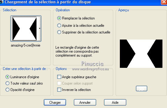 Ce tutoriel a été créé avec CorelX6 et traduit avec CorelX12, mais il peut également être exécuté avec les autres versions. Suivant la version utilisée, vous pouvez obtenir des résultats différents. Depuis la version X4, la fonction Image>Miroir a été remplacée par Image>Renverser horizontalement, et Image>Renverser avec Image>Renverser verticalement. Dans les versions X5 et X6, les fonctions ont été améliorées par la mise à disposition du menu Objets. Avec la nouvelle version X7, nous avons encore Image>Miroir et Image>Renverser/Retourner, mais avec nouvelles différences. Voir les détails à ce sujet ici Certaines dénominations ont changées entre les versions de PSP. Les plus frequentes dénominations utilisées: ![]() Traduction en italien ici Nécessaire pour réaliser ce tutoriel: Matériel ici Merci pour le tube Gabry Modules Externes: consulter, si nécessaire, ma section des filtres ici Carolaine and Sensibility - CS-LDots, Halloween 2 ici Flaming Pear - Flexify 2 ici Filters Unlimited 2.0 ici Toadies - Rasterline, What are you ici VanDerLee - Unplugged-x ici Filtres Toadies peuvent être utilisés seuls ou importés dans Filters Unlimited. voir comment le faire ici). Si un filtre est fourni avec cette icône, ![]() en fonction des couleurs utilisées, vous pouvez changer le mode mélange et l'opacité des calques. Dans les plus récentes versions de PSP, vous ne trouvez pas le dégradé d'avant plan/arrière plan ou Corel_06_029. Vous pouvez utiliser le dégradé des versions antérieures. Ici le dossier Dégradés de CorelX. Placer les sélections dans le dossier Sélections. 1. Placer en avant plan la couleur claire #564b90, et en arrière plan la couleur foncée #1f1e1c. ![]() 2. Ouvrir une nouvelle image transparente 650 x 500 pixels, et remplir du dégradé.3. Sélections>Sélectionner tout. Activer le tube woman-Gabry 104, Édition>Copier. ne pas fermer le tube; on va s'en servir plus tard Revenir sur votre travail et Édition>Coller dans la sélection. Sélections>Désélectionner tout. 4. Effets>Effets d'image>Mosaïque sans jointures, par défaut. ![]() 5. Réglage>Flou>Flou radial. ![]() 6. Calques>Dupliquer. Effets>Modules Externes>Flaming Pear - Flexify 2. ![]() 7. Calques>Dupliquer. Image>Renverser. Réduire l'opacité de ce calque à 50%. Calques>Fusionner>Fusionner le calque de dessous. 8. Effets>Effets 3D>Ombre portée, couleur noire. ![]() 9. Vous positionner sur le calque du bas de la pile. Calques>Dupliquer. 10. Effets>Modules Externes>Toadies - Rasterline. ![]() Placer le calque en mode Éclaircir et réduire l'opacitè à 25%. ![]() Effets>Effets de bords>Accentuer davantage. 11. Image>Rédimensionner, à 80%, redimensionner tous les calques décoché. 12. Effets>Effets géométriques>Inclinaison. ![]() 13. Calques>Fusionner>Tous. Édition>Copier. 14. Sélections>Sélectionner tout. Image>Ajouter des bordures, symétrique décoché, couleur d'arrière plan. ![]() 15. Sélections>Inverser. Édition>Coller dans la sélection. Sélections>Transformer la sélection en calque. Sélections>Désélectionner tout. 16. Effets>Modules Externes>VanDerLee - Unplugged-x - Defocus. ![]() Effets>Effets de bords>Accentuer davantage. 17. Sélections>Charger/Enregistrer une sélection>Charger à partir du disque. Chercher et charger la sélection amazing-1-cre@nnie. ![]() Sélections>Transformer la sélection en calque. 18. Effets>Modules Externes>Carolaine and Sensibility - CS-LDots. ![]() Sélections>Désélectionner tout. 19. Calques>Dupliquer. Image>Miroir. Image>Renverser. Calques>Fusionner>Fusionner le calque de dessous. 20. Calques>Nouveau calque raster. Sélections>Charger/Enregistrer une sélection>Charger à partir du disque. Chercher et charger la sélection amazing-2-cre@nnie. ![]() Remplir la sélection avec la couleur d'avant plan.21. Sélections>Charger/Enregistrer une sélection>Charger à partir du disque. Chercher et charger la sélection amazing-3-cre@nnie. la nouvelle sélection remplacera la précédente ![]() Presser CANC sur le clavier ![]() Sélections>Désélectionner tout. 22. Calques>Dupliquer. Image>Renverser. Calques>Fusionner>Tous. 23. Édition>Copier. Éventuellement, pour précaution: Édition>Coller comme nouvelle image, et minimiser l'image. Vous devrez garder en mémoire l'image jusqu'à l'étape 28. Si nécessaire, vous pourrez la récopier. Sélections>Sélectionner tout. 24. Image>Ajouter des bordures, 25 pixels, symétrique, couleur d'avant plan. Sélections>Inverser. Préparer en avant plan un dégradé de premier plan/arrière plan, style Linéaire. ![]() Remplir la sélection du dégradé.25. Effets>Effets de distorsion>Pixellisation. ![]() Effets>Effets de bords>Accentuer davantage. 26. Sélections>Inverser. Effets>Effets 3D>Ombre portée, comme précédemment. 27. Sélections>Sélectionner tout. Image>Ajouter des bordures, symétrique décoché, couleur d'arrière plan. ![]() 28. Sélections>Inverser. Édition>Coller dans la sélection. 29. Effets>Modules Externes>Toadies - What are you. ![]() 30. Sélections>Inverser. Effets>Effets 3D>Ombre portée, comme précédemment. 31. Calques>Nouveau calque raster. Sélections>Charger/Enregistrer une sélection>Charger à partir du disque. Chercher et charger la sélection amazing-4-cre@nnie. ![]() Placer à nouveau en avant plan la Couleur et remplir la sélection avec la couleur d'avant plan.32. Activer le tube molen - Édition>Copier. Revenir sur votre travail et Édition>Coller dans la sélection. Placer le calque en mode Lumière douce. 33. Effets>Effets 3D>Ombre portée, couleur noire. ![]() 34. Vous positionner sur le calque du bas de la pile. Sélections>Charger/Enregistrer une sélection>Charger à partir du disque. Chercher et charger la sélection amazing-5-cre@nnie. ![]() Sélections>Transformer la sélection en calque. 35. Effets>Modules Externes>Carolaine and Sensibility - Halloween2. ![]() 36. Effets>Effets 3D>Ombre portée, comme précédemment. Placer l