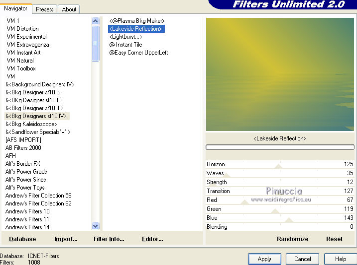 3. Effetti>Plugins>Filters Unlimited 2.0 - &<Bkg Designers sf10IV> - <Lakeside Reflection>