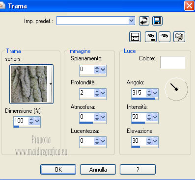 19. Effetti>Effetti di trama>Trama - seleziona la trama "schors" con i seguenti settaggi.