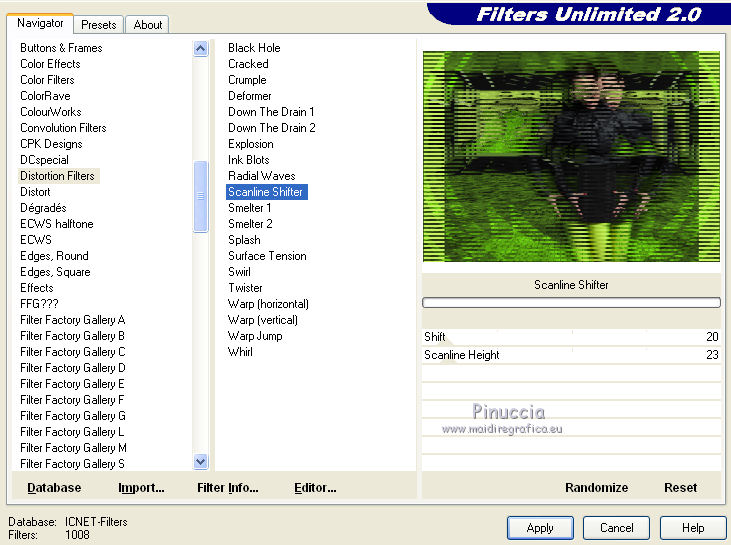 Effetti>Plugins>Filters Unlimited 2.0 - Distortion Filters - Scanline Shifter.