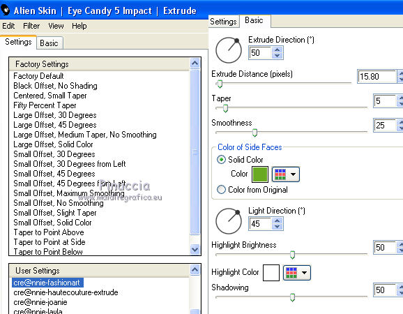 40. Effetti>Plugins>Alien Skin Eye Candy 5 Impact - Extrude, con i settaggi precedenti.