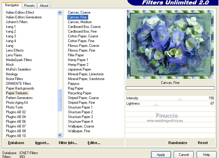 14. Effetti>Plugins>Filters Unlimited - Paper Textures - Canvas fine, con i settaggi standard.