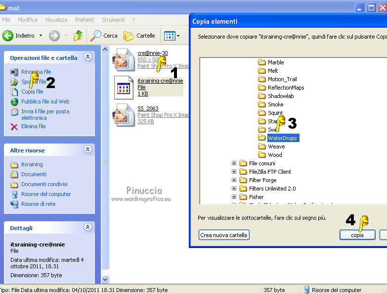 seleziona il file (1), clicca su Copia file (2), cerca la cartella in cui hai installato il filtro, seleziona la cartella Water Drops (3) e clicca Copia (4).