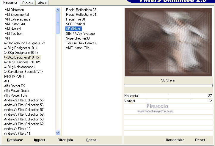 31. Effetti>Plugins>Filters Unlimited 2.0 - &<Background Designersf10III> - SE Shiver, con i settaggi standard.
