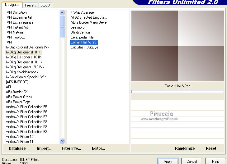 4. Effetti>Plugins>Filters Unlimited 2.0 - &<Bkg Designersf10I> - Corner half wrap:
