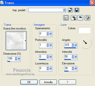 11. Effetti>Effetti di trama>Trama - seleziona la trama Grana fine nuvoloso, con i seguenti settaggi.