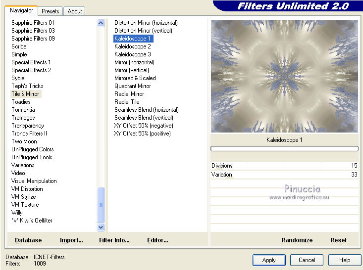 5. Effetti>Plugins>Filters Unlimited 2.0 - Tile & Mirror - Kaleidoscope 1, con i settaggi standard.