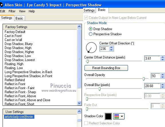 65. Effetti>Plugins>Alien Skin Eye Candy 5 Impact - Perspective Shadow, con i settaggi precedenti.