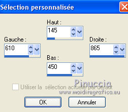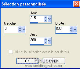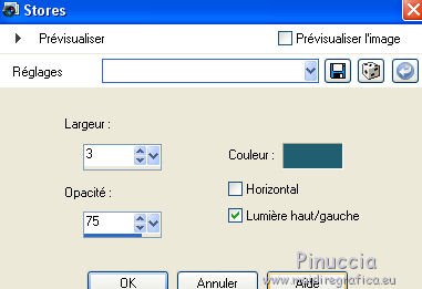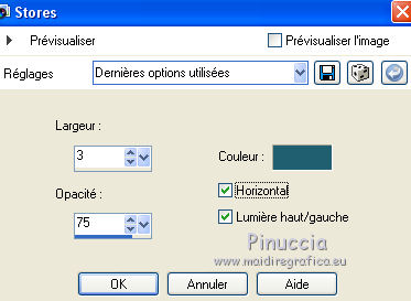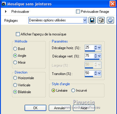 Ce tutoriel a été créé avec CorelX6 et traduit avec CorelX12, mais il peut également être exécuté avec les autres versions. Suivant la version utilisée, vous pouvez obtenir des résultats différents. Depuis la version X4, la fonction Image>Miroir a été remplacée par Image>Renverser horizontalement, et Image>Renverser avec Image>Renverser verticalement. Dans les versions X5 et X6, les fonctions ont été améliorées par la mise à disposition du menu Objets. Avec la nouvelle version X7, nous avons encore Image>Miroir et Image>Renverser/Retourner, mais avec nouvelles différences. Voir les détails à ce sujet ici Certaines dénominations ont changées entre les versions de PSP. Les plus frequentes dénominations utilisées: ![]() Traduction en italien ici Vos versions ici Nécessaire pour réaliser ce tutoriel: Matériel ici Pour le tube merci LuzCristina Modules Externes: consulter, si nécessaire, ma section des filtres ici Filters Unlimited 2.0 ici Alien Skin Eye Candy 5 Impact - Glass ici Flaming Pear - Glitterato ici Toadies - What are you ici Mehdi - Weaver, Sorting Tiles ici Mehdi - Wavy Lab 1.1 ici Filtres Toadies, Simple et VM Natural peuvent être utilisés seuls ou importés dans Filters Unlimited. voir comment le faire ici). Si un filtre est fourni avec cette icône, ![]() en fonction des couleurs utilisées, vous pouvez changer le mode mélange et l'opacité des calques. Placer le preset En cliquant sur le preset une ou deux fois (selon vos réglages) automatiquement il se placera directement dans le dossier Settings de Alien Skin Eye Candy. pourquoi un ou deux clic voir ici Placer les Sélections dans le dossier Sélections. 1. Ouvrir une nouvelle image transparente 650 x 500 pixels. 2. Placer en avant plan la couleur blanche #ffffff, et en arrière plan la couleur foncée #205f6f. ![]() 3. Effets>Modules Externes>Mehdi - Wavy Lab 1.1. Ce filtre travaille avec les couleurs de la palette: la première est la couleur d'arrière plan, la deuxième est la couleur d'avant plan. Garder les autres deux couleurs créées par le filtre. ![]() 4. Calques>Dupliquer. 5. Effets>Modules Externes>Flaming Pear - Glitterato. ![]() 6. Placer le calque en mode Lumière douce et réduire l'opacité à 50%. ![]() 7. Effets>Effets de bords>Accentuer davantage. 8. Calques>Fusionner>Fusionner le calque de dessous. 9. Image>Ajouter des bordures, symétrique décoché, couleur d'arrière plan. ![]() 10. Effets>Effets d'image>Mosaïque sans jointures. ![]() 11. Calques>Dupliquer. Image>Miroir. Image>Renverser. 12. Placer le calque en mode Lumière dure. 13. Calques>Fusionner>Fusionner le calque de dessous. 14. Activer l'outil Sélection ![]() (peu importe le type de sélection, parce que avec la sélection personnalisée vous obtenez toujours un rectangle), cliquer sur Sélection personnalisée ![]() et setter ces paramètres. ![]() Sélections>Transformer la sélection en calque. 15. Effets>Modules Externes>Flaming Pear - Glitterato, comme précédemment. Sélection>Désélectionner tout. 16. Effets>Modules Externes>Toadies - What are you. ![]() 17. Sélection>Sélectionner tout. Image>Ajouter des bordures, 50 pixels, symétrique, couleur d'arrière plan. 18. Effets>Effets d'image>Mosaïque sans jointures, comme précédemment. 19. Effets>Effets 3D>Ombre portée, couleur noire. ![]() Sélection>Désélectionner tout. 20. Effets>Effets d'image>Mosaïque sans jointures, comme précédemment. 21. Sélection personnalisée ![]() ![]() Sélections>Transformer la sélection en calque. 22. Effets>Effets de textures>Stores, couleur d'arrière plan. ![]() 23. Effets>Modules Externes>Alien Skin Eye Candy 5 Impact - Glass. sélectionner le preset birgit-cre@nnie-glass et ok. ![]() Ci-dessous les règlages en cas de problèmes avec le preset. ![]() Effets>Effets de bords>Accentuer. 25. Calques>Noveau calque raster. Sélection personnalisée ![]() ![]() 26. Remplir la sélection avec la couleur d'avant plan.Sélection>Désélectionner tout. 27. Effets>Modules Externes>Toadies - What are you. ![]() Effets>Effets de bords>Accentuer. 28. Sélection personnalisée comme précédemment![]() 29. Effets>Modules Externes>Toadies - What are you. ![]() Sélection>Désélectionner tout. 30. Effets>Effets de textures>Stores, comme précédemment, mais horizontal décoché. ![]() 31. Calques>Noveau calque raster. Sélections>Charger/Enregistrer une sélection>Charger à partir du disque. Chercher et charger la sélection birgit-1-cre@nnie. ![]() Remplir la sélection avec la couleur d'arrière plan.32. Effets>Modules Externes>Alien Skin Eye Candy 5 Impact - Glass, Sélectionner le preset Clear et ok. ![]() 33. Effets>Effets 3D>Ombre portée, couleur noire. ![]() Sélection>Désélectionner tout. 34. Vous positionner sur le calque du bas de la pile. Effets>Effets de bords>Accentuer. 35. Calques>Noveau calque raster. Sélections>Charger/Enregistrer une sélection>Charger à partir du disque. Chercher et charger la sélection birgit-2-cre@nnie. ![]() Sélections>Transformer la sélection en calque. Sélection>Désélectionner tout. 36. Effets>Modules Externes>Mehdi - Weaver. ![]() 37. Effets>Effets de bords>Dilater. Effets>Effets de bords>Accentuer. 38. Calques>Dupliquer. Image>Renverser. 39. Calques>Noveau calque raster. Sélections personnalisée ![]() ![]() Remplir la sélection avec la couleur d'avant plan.40. Sélections>Modifier>Contracter - 10 pixels. Presser CANC sur le clavier ![]() Sélection>Désélectionner tout. 41. Calques>Dupliquer. Effets>Effets d'image>Mosaïque sans jointures, par défaut. ![]() 42. Image>Miroir. 43. Activer le calque de dessous - raster 4. ![]() 44. Activer l'outil Baguette magique ![]() ![]() et cliquer dans le cadre pour le sélectionner. Remplir avec la couleur d'arrière plan.45. Sélections>Modifier>Contracter - 10 pixels. Riempi la sélection avec la couleur d'avant plan.46. Sélections>Modifier>Contracter - 10 pixels. Riempi avec la couleur d'arrière plan.47. Sélections>