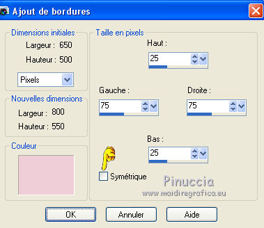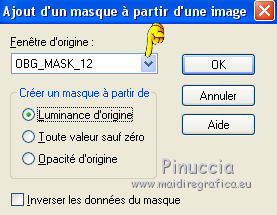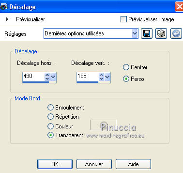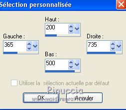 Ce tutoriel a été créé avec CorelX6 et traduit avec CorelX12, mais il peut également être exécuté avec les autres versions. Suivant la version utilisée, vous pouvez obtenir des résultats différents. Depuis la version X4, la fonction Image>Miroir a été remplacée par Image>Renverser horizontalement, et Image>Renverser avec Image>Renverser verticalement. Dans les versions X5 et X6, les fonctions ont été améliorées par la mise à disposition du menu Objets. Avec la nouvelle version X7, nous avons encore Image>Miroir et Image>Renverser/Retourner, mais avec nouvelles différences. Voir les détails à ce sujet ici Certaines dénominations ont changées entre les versions de PSP. Les plus frequentes dénominations utilisées: ![]() Traduction en italien ici Vos versions ici Nécessaire pour réaliser ce tutoriel: Matériel ici Merci pour le tube Hazal et pour les masques Occhiblu Modules Externes: consulter, si nécessaire, ma section des filtres ici AAA Frames - Foto Frame ici Mura's Meister - Perspective Tiling ici L&K's - L&K's Adonis ici L&K's - L&K's Elvida ici L&K's - L&K's Zitah ici Toadies - What are you ici Filters Unlimited 2.0 ici Filtres Toadies peuvent être utilisés seuls ou importés dans Filters Unlimited. voir comment le faire ici) mais ils peuvent obtenir des résultats différents. ![]() en fonction des couleurs utilisées, vous pouvez changer le mode mélange et l'opacité des calques. Placer les sélections dans le dossier Sélections. Ouvrir les masques dans PSP et les minimiser avec le reste du matériel. 1. Ouvrir une nouvelle image transparente 650 x 500 pixels. 2. Placer en avant plan la couleur claire #efced7, et en arrière plan la couleur foncée #608b33. ![]() 3. Remplir l'image transparente avec la couleur d'avant plan.4. Calques>Nouveau calque raster. Remplir avec la couleur d'arrière plan.5. Calques>Nouveau calque de masque>A partir d'une image. Ouvrir le menu deroulant sous la fenêtre d'origine et vous verrez la liste des images ouverts. Sélectionner le masque OBG_MASK_12. ![]() Calques>Fusionner>Fusionner le groupe. 6. Calques>Fusionner>Calques visibles. 7. Activer l'outil Sélection ![]() (peu importe le type de sélection, parce que avec la sélection personnalisée vous obtenez toujours un rectangle), cliquer sur Sélection personnalisée ![]() et setter ces paramètres. ![]() 8. Ouvrir le tube womantubes393-HaZal - Édition>Copier. Revenir sur votre travail et Édition>Coller comme nouveau calque. Positionner le tube sur la sélection.9. Sélections>Inverser. Presser CANC sur le clavier ![]() Sélections>Inverser. 10. Effets>Effets 3D>Ombre portée, couleur noire. ![]() 11. Effets>Effets 3D>Ombre portée, couleur noire. ![]() Sélections>Désélectionner tout. 12. Calques>Fusionner>Calques visibles. 13. Effets>Modules Externes>AAA Frames - Foto Frame. ![]() 14. Fenêtre>Dupliquer, et minimiser cette image: on va s'en servir plus tard. 15. Revenir sur votre travail. Image>Ajouter des bordures, symétrique décoché, couleur d'avant plan. ![]() 16. Effets>Effets d'image>Mosaïque sans jointures, par défaut. ![]() 17. Réglage>Flou>Flou gaussien - rayon 30. ![]() 18. Calques>Dupliquer. Calques>Nouveau calque de masque>A partir d'une image. Ouvrir le menu deroulant sous la fenêtre d'origine et sélectionner le masque OBG_Mask_04. ![]() Calques>Fusionner>Fusionner le groupe. ne vous inquiétez pas si vous aurez l'impression de rien voir 19. Effets>Effets de bords>Accentuer davantage. Effets>Effets de bords>Dilater. 20. Calques>Dupliquer. Image>Miroir. Image>Renverser. 21. Vous positionner sur le calque du bas de la pile. Sélections>Charger/Enregistrer une sélection>Charger à partir du disque. Chercher et charger la sélection bliss-1-cre@nnie. ![]() 22. Effets>Modules Externes>L&K landksiteofwonders - L&K's Adonis. ![]() 23. Sélections>Modifier la sélection, et la partie sélectionné deviendra rouge. ![]() 24. Image>Miroir. Image>Renverser, et la sélection sera en bas à droite. ![]() 25. Sélections>Modifier la sélection, et la sélection reviendra normale. ![]() 26. Effets>Modules Externes>L&K landksiteofwonders - L&K's Zitah. ![]() 27. Sélections>Charger/Enregistrer une sélection>Charger à partir du disque. Chercher et charger la sélection bliss-2-cre@nnie. ![]() 28. Effets>Modules Externes>L&K landksiteofwonders - L&K's Elvida. ![]() Sélections>Désélectionner tout. 29. Image>Ajouter des bordures, symétrique décoché, couleur d'avant plan. ![]() 30. Effets>Effets d'image>Mosaïque sans jointures. ![]() 31. Sélection personnalisée ![]() ![]() 32. Calques>Nouveau calque raster. Effets>Effets 3D>Ombre portée, couleur noire. ![]() Sélections>Désélectionner tout. 33. Effets>Effets d'image>Mosaïque sans jointures. ![]() 34. Effets>Modules Externes>Toadies - What are you, par défaut. ![]() 35. Calques>Dupliquer. Image>Miroir. 36. Effets>Effets de distorsion>Vagues. ![]() 37. Calques>Fusionner>Fusionner le calque de dessous. 38. Calques>Dupliquer. Calques>Fusionner>Fusionner le calque de dessous. 39. Édition>Coller comme nouveau calque (votre tube est toujours en mémoire). 40. Image>Redimensionner, à 150%, redimensionner tous les calques décoché. Déplacer à droite, avec la tête contre le bord supérieur.![]() Réduire l'opacité de ce calque à 30%. ![]() 41. Calques>Agencer>Déplacer vers le bas. 42. Vous positionner sur le calque du bas de la pile. 43. Calques>Dupliquer. Effets>Modules Externes>Mura's Meister - Perspective Shadow. ![]() 44. Effets>Effets 3D>Ombre portée, comme précédemment. 45. Calques>Agencer>Placer en haut de la pile. 46. Activer le cadre minimisé à l'étape 14. Édition>Copier. Revenir sur votre travail et Édition>Coller comme nouveau calque. 47. Image>Redimensionner, à 40%, redimensionner tous les calques décoché. 48. Effets>Effets d'image>Décalage. ![]() 49. Effets>Effets 3D>Ombre portée, comme précédemment. 50. Calques>Dupliquer. Image>Redimensionner, à 50%, redimensionne