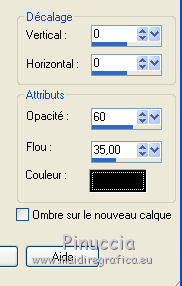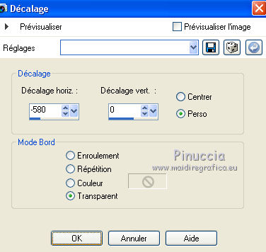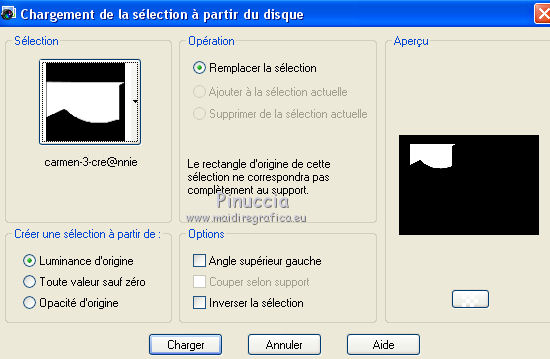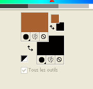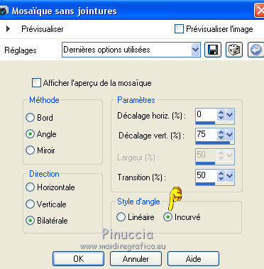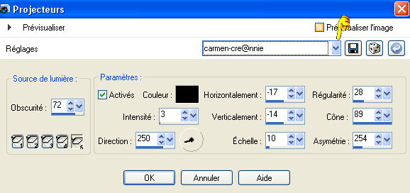 Ce tutoriel a été créé avec CorelX6 et traduit avec CorelX12, mais il peut également être exécuté avec les autres versions. Suivant la version utilisée, vous pouvez obtenir des résultats différents. Depuis la version X4, la fonction Image>Miroir a été remplacée par Image>Renverser horizontalement, et Image>Renverser avec Image>Renverser verticalement. Dans les versions X5 et X6, les fonctions ont été améliorées par la mise à disposition du menu Objets. Avec la nouvelle version X7, nous avons encore Image>Miroir et Image>Renverser/Retourner, mais avec nouvelles différences. Voir les détails à ce sujet ici Certaines dénominations ont changées entre les versions de PSP. Les plus frequentes dénominations utilisées: ![]() Traduction en italien ici Vos versions ici Nécessaire pour réaliser ce tutoriel: Matériel ici Merci pour les tubes Gabry Modules Externes: consulter, si nécessaire, ma section des filtres ici Filters Unlimited 2.0 ici VM Natural - Sparkle, Splash ici Mura's Meister - Perspective Tiling ici Mehdi - Sorting Tiles ici Filtres VM Natural peuvent être utilisés seuls ou importés dans Filters Unlimited. voir comment le faire ici). Si un filtre est fourni avec cette icône, ![]() en fonction des couleurs utilisées, vous pouvez changer le mode mélange et l'opacité des calques. Placer le preset Preset_Lights_carmen-cre@nnie dans le dossier Paramètres par défaut. Placer les sélections dans le dossier Sélections. 1. Ouvrir une nouvelle image transparente 650 x 500 pixels. 2. Placer en avant plan la couleur claire #a9612f, et en arrière plan la couleur foncée #040000. ![]() Remplir l'image transparente avec la couleur d'arrière plan.3. Sélections>Sélectionner tout. Ouvrir le tube gabry-woman 138 - Édition>Copier. ne pas fermer le tube: on va s'en servir plus tard Revenir sur votre travail et Édition>Coller dans la sélection. Sélections>Désélectionner tout. 4. Réglage>Flou>Flou radial. ![]() 5. Calques>Dupliquer. Image>Miroir. Image>Renverser. Réduire l'opacité de ce calque à 50%. Calques>Fusionner>Fusionner le calque de dessous. Effets>Effets de bords>Accentuer davantage. 5. Sélection>Charger/Enregistrer une sélection>Charger à partir du disque. Chercher et charger la sélection carmen-1-cre@nnie. ![]() 6. Effets>Modules Externes>Mehdi - Sorting Tiles. ![]() 7. Effets>Modules Externes>Filters Unlimited 2.0 - Convolution filters - Emboss(strong) ![]() Répéter le filtre une deuxième fois (il faut règler à nouveau emboss: 255, parce que Unlimited ne garde pas les règlages en mémoire). 8. Sélections>Transformer la sélection en calque. Effets>Effets 3D>Ombre portée. ![]() Sélections>Désélectionner tout. 9. Calques>Dupliquer. Image>Miroir. Image>Renverser. Calques>Fusionner>Fusionner le calque de dessous. 10. Calques>Dupliquer. Effets>Effets géométriques>Inclinaison. ![]() 11. Image>Miroir. Calques>Fusionner>Fusionner le calque de dessous. 12. Activer l'outil Baguette magique ![]() ![]() et cliquer sur la partie transparente au centre de l'image. ![]() 13. Vous positionner sur le calque du bas de la pile. Sélections>Transformer la sélection en calque. 14. Effets>Effets 3D>Ombre portée, couleur noire. ![]() 15. Sélections>Modifier>Contracter - 50 pixels. Effets>Effets 3D>Ombre portée, comme précédemment. Sélections>Désélectionner tout. 16. Image>Miroir. Calques>Fusionner>Calques visibles. 17. Édition>Copier. 18. Sélections>Sélectionner tout. Image>Ajouter des bordures, symétrique décoché, couleur d'avant plan. ![]() 19. Sélection>Inverser. Édition>Coller dans la sélection. 20. Sélection>Inverser. Effets>Effets d'image>Mosaïque sans jointures, par défaut. ![]() 21. Effets>Effets 3D>Ombre portée, comme précédemment. 22. Sélections>Modifier>Sélectionner les bordures de la sélection. ![]() Remplir la sélection avec la couleur d'avant plan.Sélections>Désélectionner tout. 23. Image>Ajouter des bordures, 3 pixels, symétrique, couleur d'avant plan. Image>Ajouter des bordures, symétrique décoché, couleur d'arrière plan. ![]() 24. Effets>Effets d'image>Mosaïque sans jointures ![]() 25. Calques>Dupliquer. Effets>Modules Externes>Mura's Meister - Perspective Tiling. ![]() 26. Édition>Copier. Vous positionner sur le calque du bas de la pile. 27. Effets>Effets d'éclairage>Projecteurs. sélectionner le preset carmen-cre@annie et ok. ![]() 28. Image>Ajouter des bordures, symétrique décoché, couleur d'arrière plan. ![]() 29. Édition>Coller comme nouveau calque. Effets>Effets d'image>Décalage. ![]() 30. Sélections>Sélectionner tout. Image>Ajouter des bordures, symétrique décoché, couleur d'arrière plan. ![]() Sélection>Inverser. 31. Effets>Modules Externes>VM Natural - Sparkle. ![]() 32. Effets>Modules Externes>VM Natural - Splash. ![]() 33. Sélection>Inverser. Sélections>Modifier>Sélectionner les bordures de la sélection, comme précédemment. Remplir la sélection avec la couleur d'avant plan.34. Sélection>Charger/Enregistrer une sélection>Charger à partir du disque. Chercher et charger la sélection carmen-2-cre@nnie. ![]() 35. Effets>Modules Externes>VM Natural - Sparkle, comme précédemment. Sélections>Transformer la sélection en calque. Sélections>Désélectionner tout. Placer le calque en mode Recouvrement. ![]() 36. Ouvrir le tube Gabry-varie ornamenti-10, - Édition>Copier. Revenir sur votre travail et Édition>Coller comme nouveau calque. Image>Redimensionner, à 80%, redimensionner tous les calques décoché. Déplacer le tube en bas à gauche (voir mon exemple).37. Calques>Dupliquer. Réglage>Flou>Flou directionnel. ![]() Placer le calque en mode Multiplier. Calques>Agencer>Déplacer vers le bas. 38. Vous positionner sur le calque du haut de la pile. Effets>Effets 3D>Ombre portée, comme précédemment. 39. Activer à nouveau le tube Gabry-woman138, - Édition>Copier. Revenir sur votre travail et Édition>Coller comme nouveau calque. Image>Redimensionner, à 90%, re