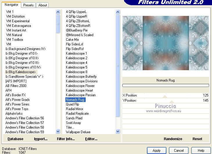32. Effetti>Plugins>Filters Unlimited 2.0 - &<Bkg Kaleidoscope> - Nomads Rug.