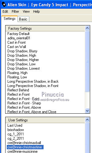 Metti il preset cre@nnie-christmastime nella cartella del filtro Alien Skin Eye Candy 5 Impact>Settings>Shadow. Doppio clic sul file e il preset sarà automaticamente installato.