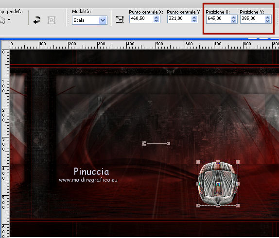 e imposta Posizione X: 645,00 e Posizione Y: 385,00.