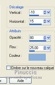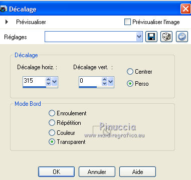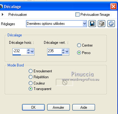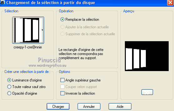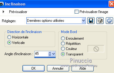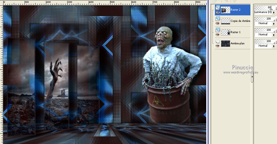 Ce tutoriel a été créé avec CorelX6 et traduit avec CorelX12, mais il peut également être exécuté avec les autres versions. Suivant la version utilisée, vous pouvez obtenir des résultats différents. Depuis la version X4, la fonction Image>Miroir a été remplacée par Image>Renverser horizontalement, et Image>Renverser avec Image>Renverser verticalement. Dans les versions X5 et X6, les fonctions ont été améliorées par la mise à disposition du menu Objets. Avec la nouvelle version X7, nous avons encore Image>Miroir et Image>Renverser/Retourner, mais avec nouvelles différences. Voir les détails à ce sujet ici Certaines dénominations ont changées entre les versions de PSP. Les plus frequentes dénominations utilisées: ![]() Traduction en italien ici Vos versions ici Nécessaire pour réaliser ce tutoriel: Matériel ici Modules Externes: consulter, si nécessaire, ma section des filtres ici Filters Unlimited 2.0 ici Mura's Meister - Perspective Tiling ici Plugin Galaxy ici Simple - Zoom out and flip ici Simple - Left right wrap (bonus) ici Filtres Toadies et Simple peuvent être utilisés seuls ou importés dans Filters Unlimited. voir comment le faire ici). Si un filtre est fourni avec cette icône, ![]() en fonction des couleurs utilisées, vous pouvez changer le mode mélange et l'opacité des calques. Placer le preset Emboss 3 dans le dossier Paramètres par défaut. Placer les sélections dans le dossier Sélections. 1. Ouvrir une nouvelle image transparente 650 x 500 pixels. 2. Placer en avant plan la couleur claire #8ab1dc, et en arrière plan la couleur foncée #261211. ![]() 3. Remplir l'image transparente avec la couleur d'avant plan.4. Sélections>Sélectionner tout. Activer le tube creepy1, Édition>Copier. Revenir sur votre travail et Édition>Coller dans la sélection. Sélections>Désélectionner tout. 5. Effets>Effets d'image>Mosaïque sans jointures, par défaut. ![]() 6. Réglage>Flou>Flou gaussien - rayon 20. ![]() 7. Effets>Modules Externes>The Plugin Site - Warp 1. ![]() 8. Image>Ajouter des bordures, symétrique décoché, couleur d'avant plan. ![]() 9. Calques>Dupliquer. Effets>Modules Externes>Simple - Left right wrap. Placer le calque en mode Assombrir davantage. ![]() 10. Calques>Fusionner>Fusionner le calque de dessous. 11. Calques>Dupliquer. Image>Renverser. 12. Effets>Effets géométriques>Inclinaison. ![]() Placer le calque en mode Assombrir davantage. ![]() 13. Calques>Dupliquer. Image>Miroir. Calques>Fusionner>Fusionner le calque de dessous. 14. Activer l'outil Sélection ![]() (peu importe le type de sélection, parce que avec la sélection personnalisée vous obtenez toujours un rectangle), cliquer sur Sélection personnalisée ![]() et setter ces paramètres. ![]() Sélections>Transformer la sélection en calque. 15. Effets>Effets 3D>Ombre portée, couleur noire. ![]() Sélections>Désélectionner tout. 16. Effets>Modules Externes>Simple - Zoom out and flip. 17. Calques>Dupliquer. Effets>Modules Externes>The Plugin Site - Instant Mirror. ![]() 18. Calques>Dupliquer. Image>Renverser. Calques>Fusionner>Fusionner le calque de dessous. Édition>Répéter Fusionner le calque de dessous. Placer le calque en mode Lumière dure. ![]() 19. Image>Ajouter des bordures, symétrique décoché, couleur d'arrière plan. ![]() 20. Effets>Effets d'image>Mosaïque sans jointures. ![]() Effets>Effets de bords>Accentuer. 21. Image>Ajouter des bordures, 25 pixels, symétrique, couleur d'arrière plan. 22. Effets>Effets d'image>Mosaïque sans jointures, par défaut. ![]() 23. Calques>Dupliquer. Effets>Modules Externes>Mura's Meister - Perspective Tiling. ![]() 24. Effets>Effets 3D>Ombre portée, comme précédemment. 25. Édition>Coller comme nouveau calque (le tube creepy1 est toujours en mémoire). 26. Image>Redimensionner, à 75%, redimensionner tous les calques décoché. 27. Effets>Effets d'image>Décalage. ![]() 28. Effets>Effets 3D>Ombre portée, couleur noire. ![]() Calques>Agencer>Déplacer vers le bas. 29. Vous positionner sur le calque du haut de la pile. Calques>Nouveau calque raster. 30. Sélections>Charger/Enregistrer une sélection>Charger à partir du disque. Chercher et charger la sélection creepy-1-cre@nnie. ![]() 31. Activer l'image Creepy, Édition>Copier. Revenir sur votre travail et Édition>Coller dans la sélection. 32. Sélections>Modifier>Sélectionner les bordures de la sélection. ![]() 33. Calques>Nouveau calque raster. Remplir la sélection avec la couleur d'arrière plan.Sélections>Désélectionner tout. 34. Effets>Effets de bords>Accentuer. Calques>Fusionner>Fusionner le calque de dessous. 35. Effets>Effets 3D>Ombre portée, comme précédemment. 36. Placer le calque en mode Luminance (héritée) et réduire l'opacité à 80%. ![]() 37. Effets>Filtre personnalisé - sélectionner le preset Emboss 3 et ok. ![]() 38. Activer le tube deco-creepy-1-cre@nnie, Édition>Copier. Revenir sur votre travail et Édition>Coller comme nouveau calque. 39. Effets>Effets d'image>Décalage. ![]() 40. Effets>Effets 3D>Ombre portée, comme précédemment. 41. Vous positionner sur le calque du bas de la pile. Édition>Copier. 42. Sélections>Sélectionner tout. Image>Ajouter des bordures, 75 pixels, symétrique, couleur d'arrière plan. Sélections>Inverser. 43. Édition>Coller dans la sélection. 44. Réglage>Flou>Flou gaussien, comme précédemment. 45. Effets>Effets de textures>Stores. ![]() 46. Sélections>Inverser. Effets>Effets 3D>Ombre portée, comme précédemment. Répéter Ombre portée, mais horizontal -25. ![]() 47. Calques>Nouveau calque raster. Sélections>Charger/Enregistrer une sélection>Charger à partir du disque. Chercher et charger la sélection creepy-2-cre@nnie. ![]() 48. Édition>Coller dans la sélection (l'image copiée à l'étape 41 est toujours en mémoire). Sélections>Désélectionner tout. Effets>Effets de bords>Accentuer. Effets>Effets de bords>Accentuer davantage. 49. Effets>Effets 3D>Ombre portée, couleur d'a
