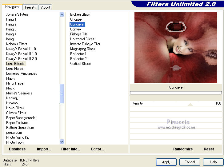 12. Effetti>Plugins>Filters Unlimited 2.0 - Lens Effects - Concave, con i settaggi standard.